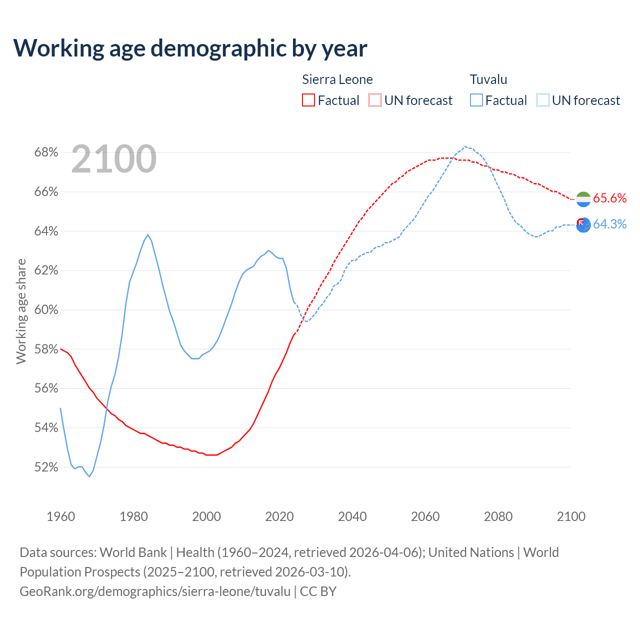 - Sierra Leone has 5.31M working age adults (aged 15-64) vs 5.64K in Tuvalu.