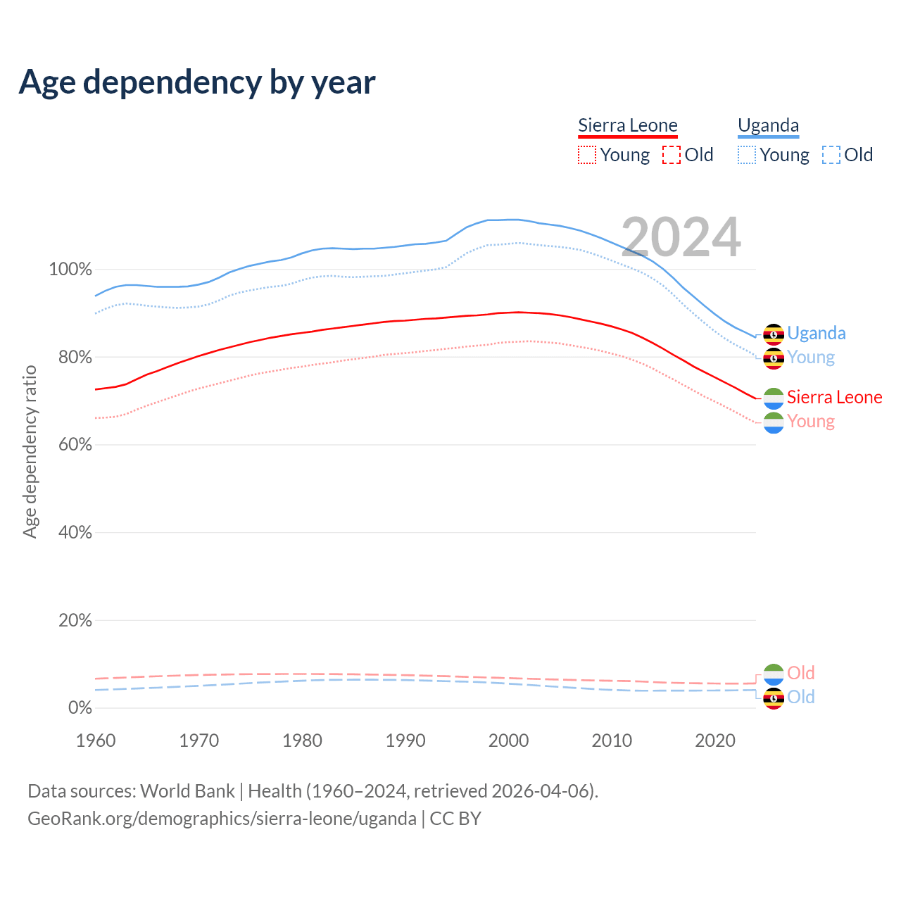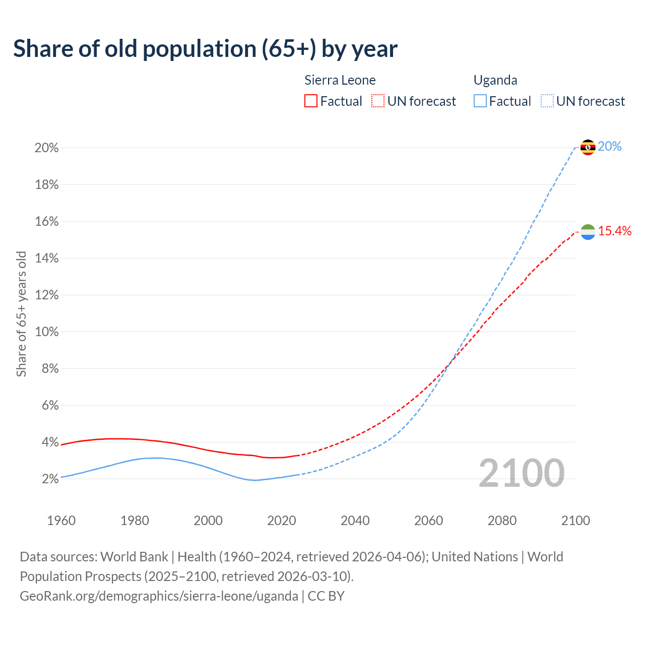 The share of older people aged 65 and over is 3.24% in Sierra Leone and 2.19% in Uganda. Life expectancy in Sierra Leone compared to Uganda .