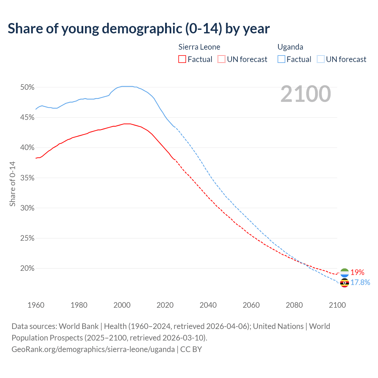 - The share of young demographic (0-15 years old) in Sierra Leone is 38.1% vs 43.5% in Uganda.