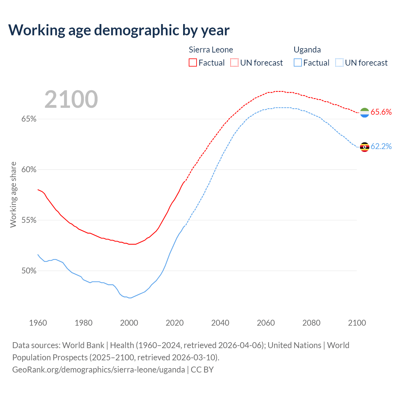 - Sierra Leone has 5.31M working age adults (aged 15-64) vs 28.9M in Uganda.