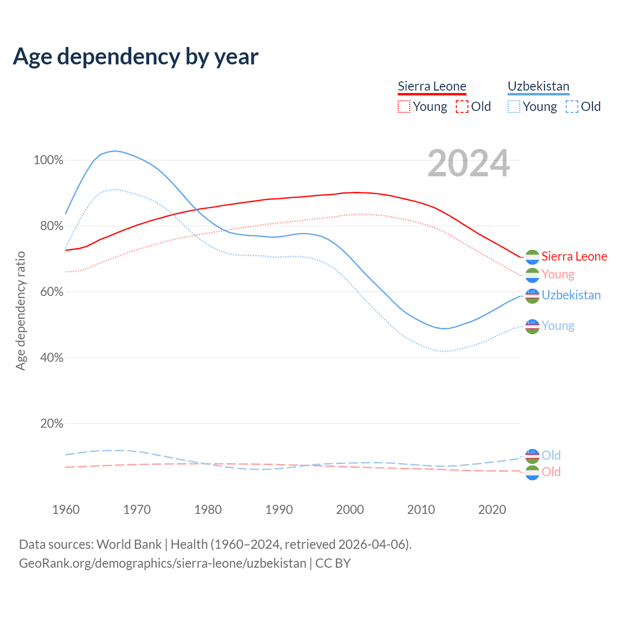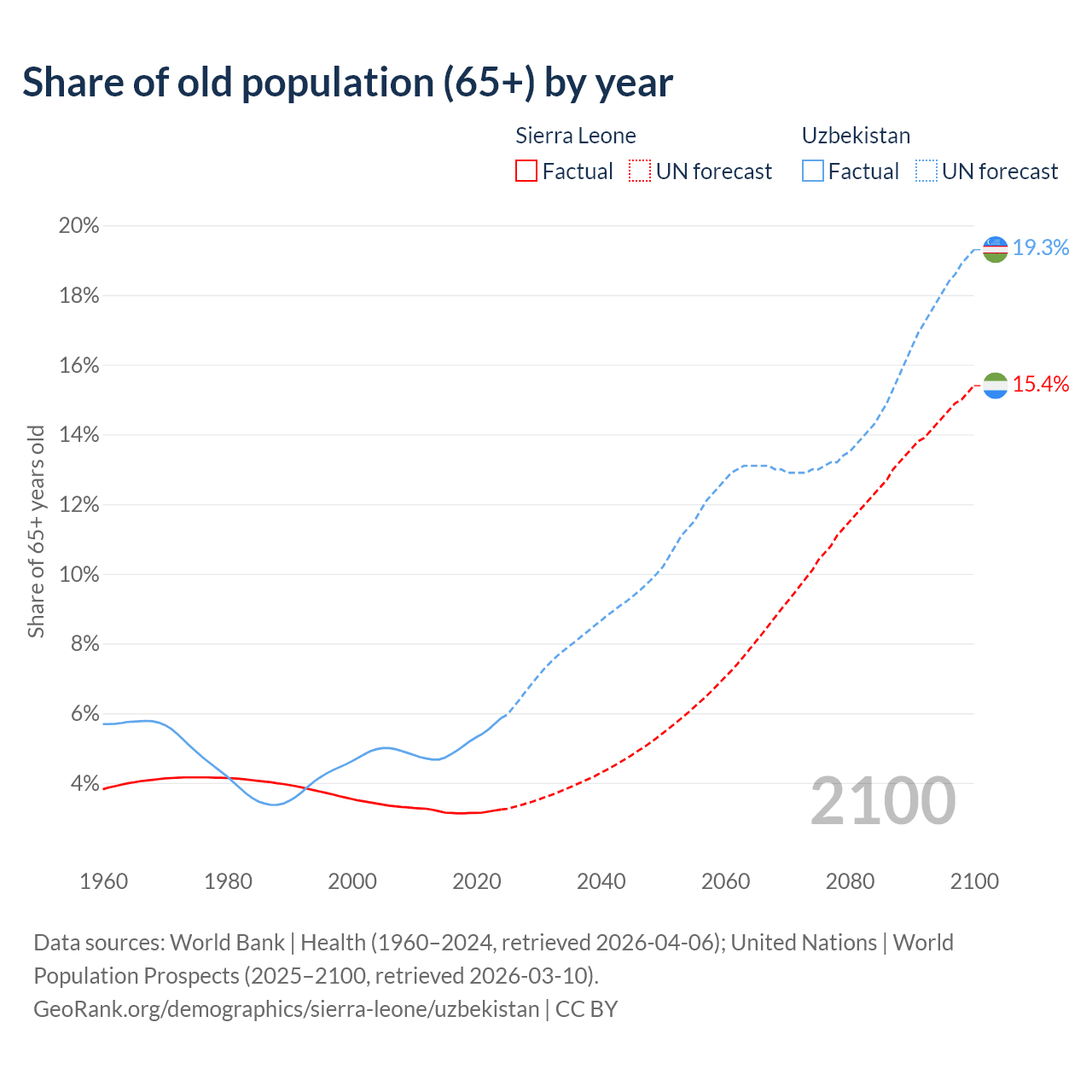- The share of old-age demographic (65+) in Sierra Leone is 3.24% vs 5.86% in Uzbekistan.