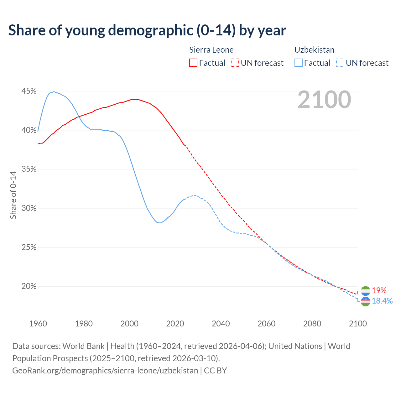 - The share of young demographic (0-15 years old) in Sierra Leone is 38.1% vs 31.1% in Uzbekistan.