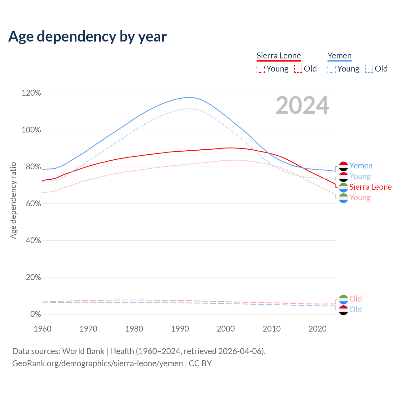 - The share of old-age demographic (65+) in Sierra Leone is 3.24% vs 2.52% in Yemen.
