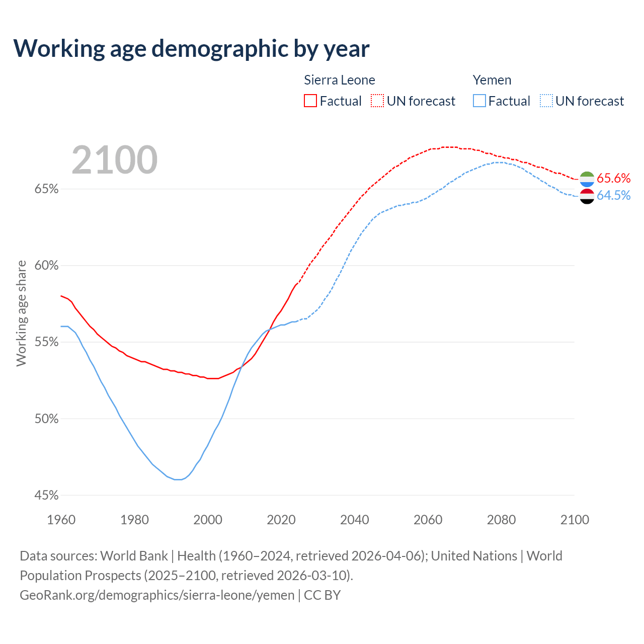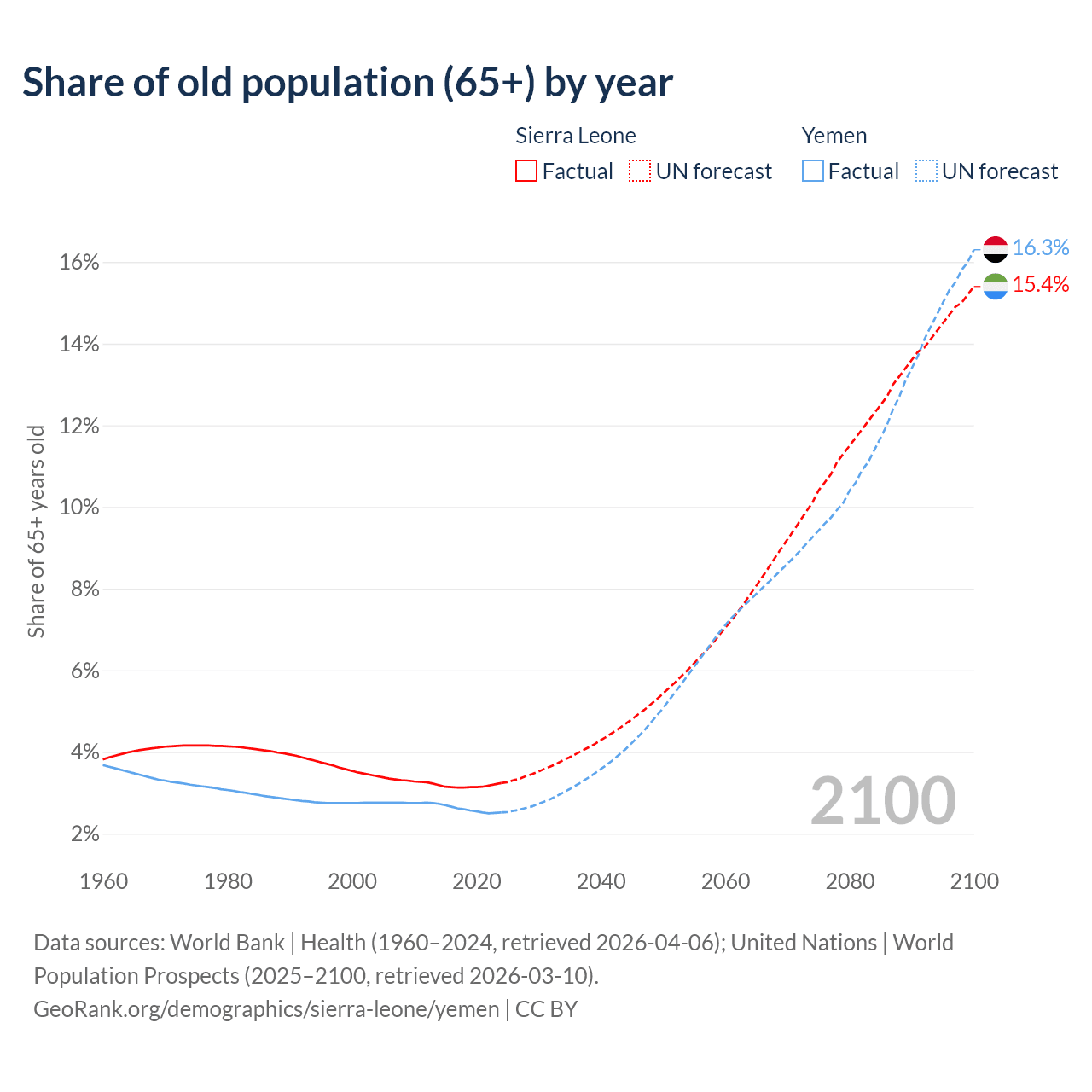 The share of older people aged 65 and over is 3.24% in Sierra Leone and 2.52% in Yemen. Life expectancy in Sierra Leone compared to Yemen .