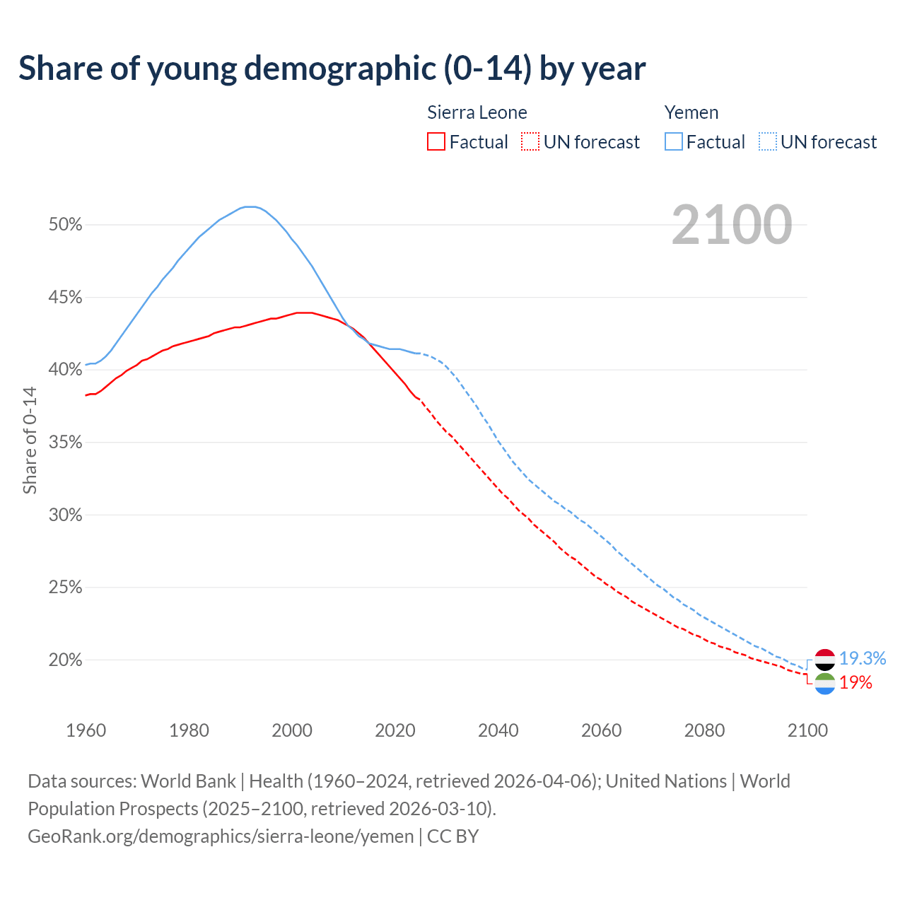 - The share of young demographic (0-15 years old) in Sierra Leone is 38.1% vs 41.1% in Yemen.