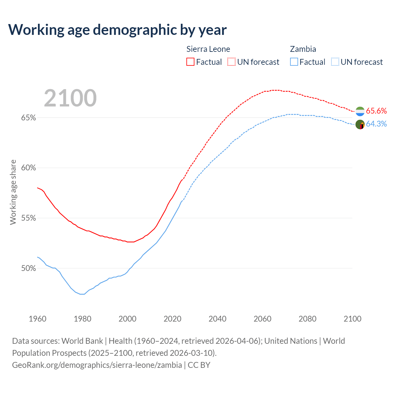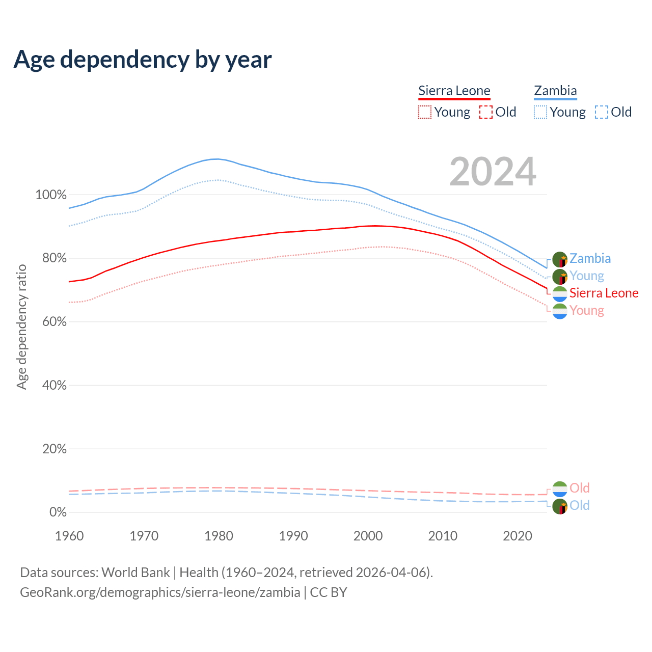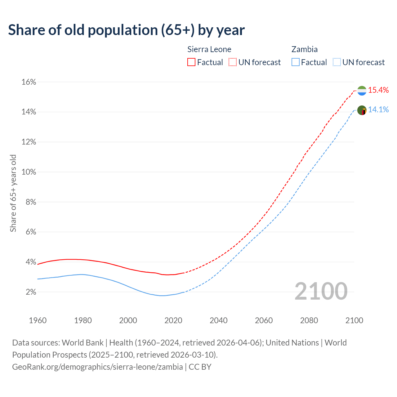 The share of older people aged 65 and over is 3.24% in Sierra Leone and 1.95% in Zambia. Life expectancy in Sierra Leone compared to Zambia .