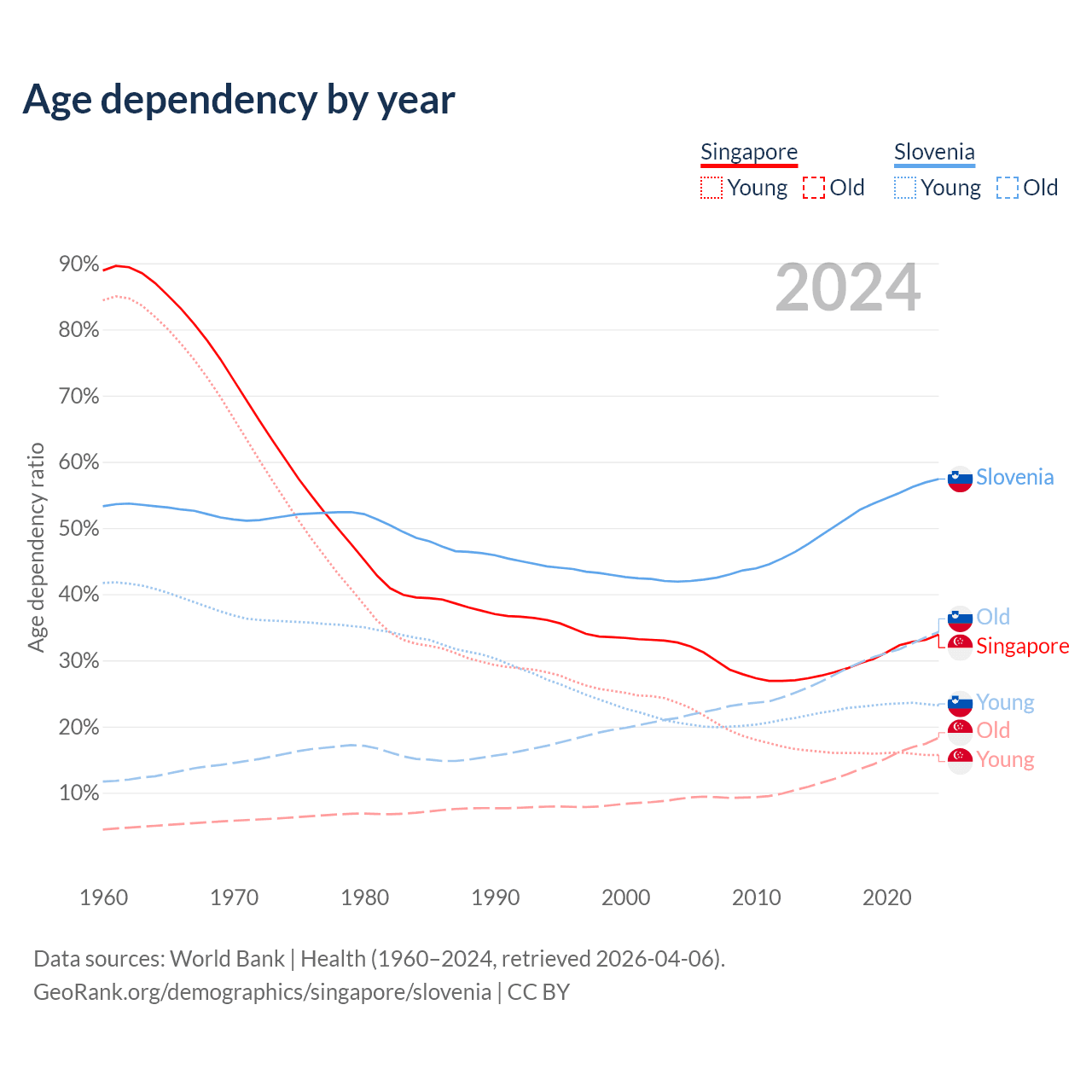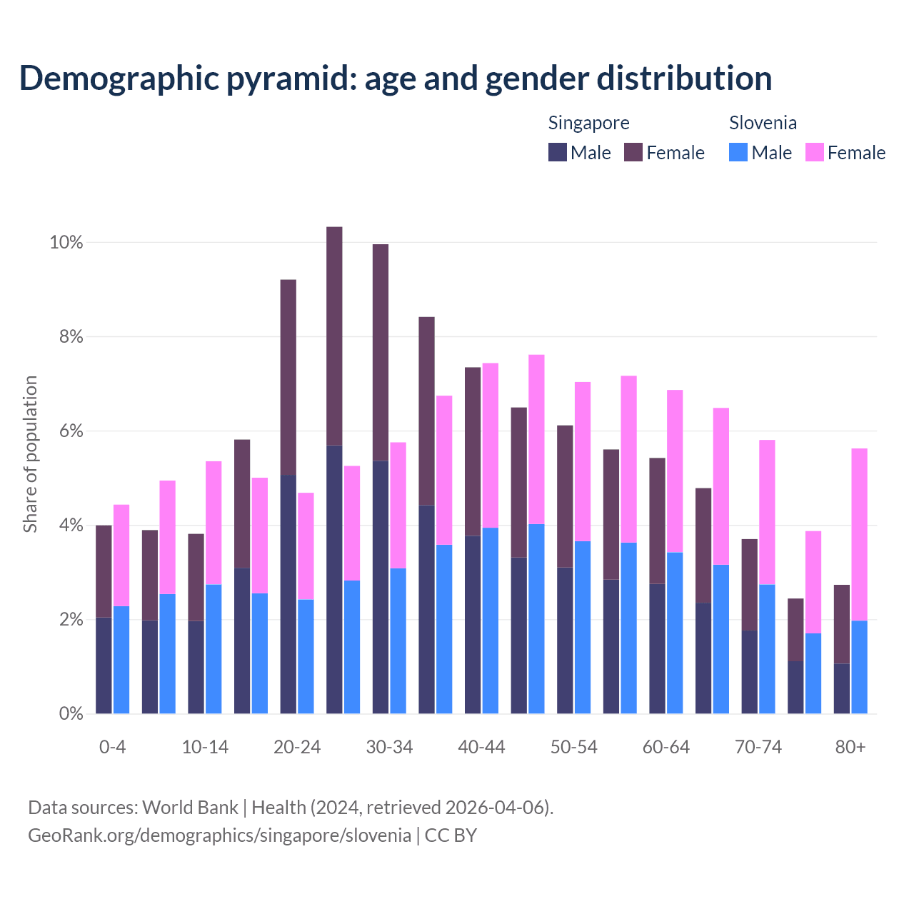 - Singapore is ranked 68/196 by median age (oldest to youngest) vs 14/196 for Slovenia.