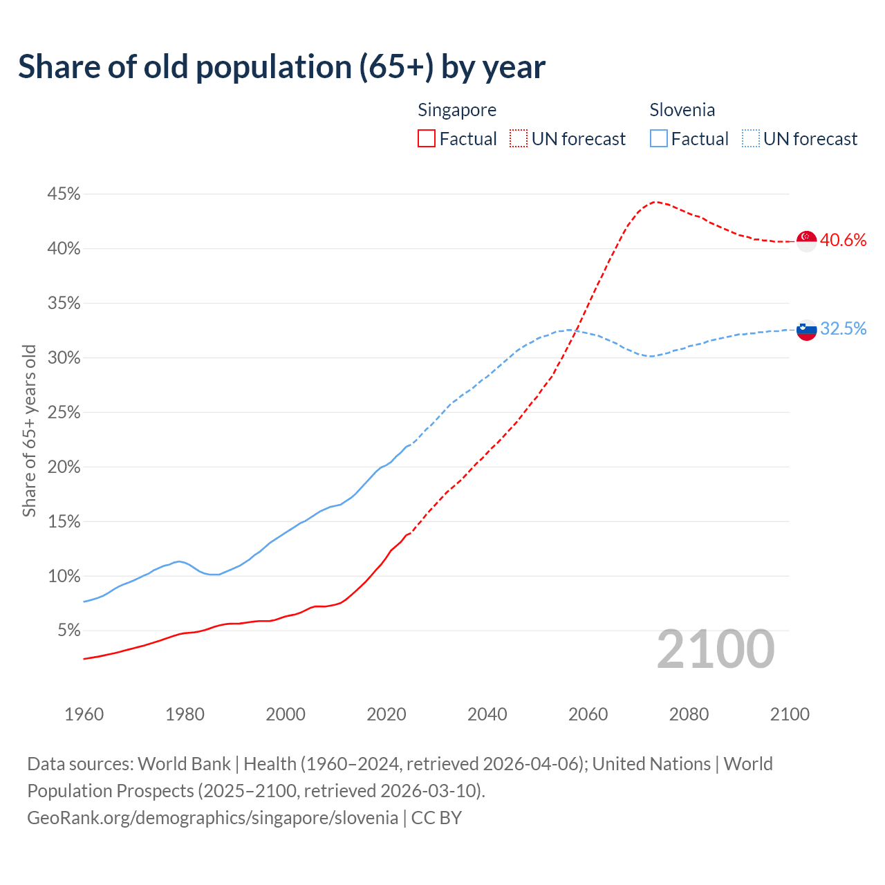 The share of older people aged 65 and over is 13.7% in Singapore and 21.8% in Slovenia. Life expectancy in Singapore compared to Slovenia .