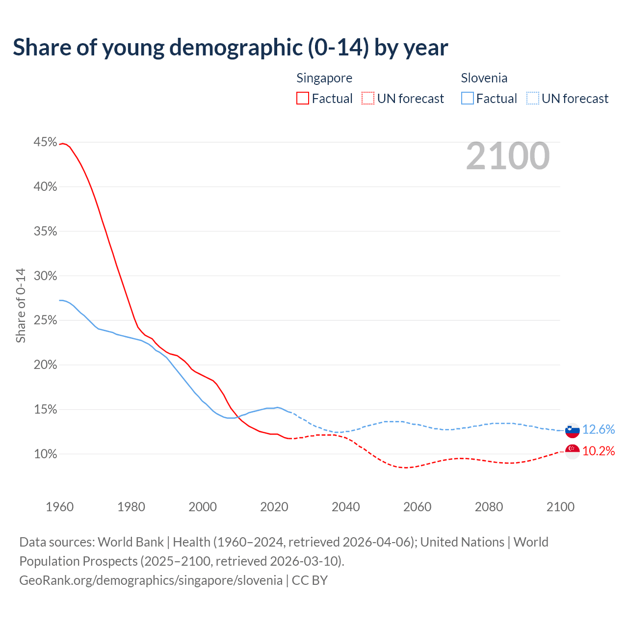 - The share of young demographic (0-15 years old) in Singapore is 11.7% vs 14.7% in Slovenia.