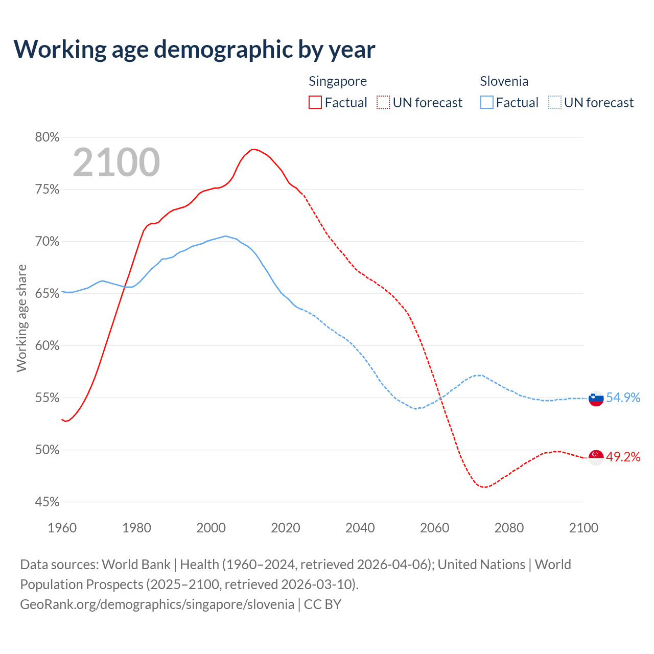 - Singapore has 4.57M working age adults (aged 15-64) vs 1.35M in Slovenia.
