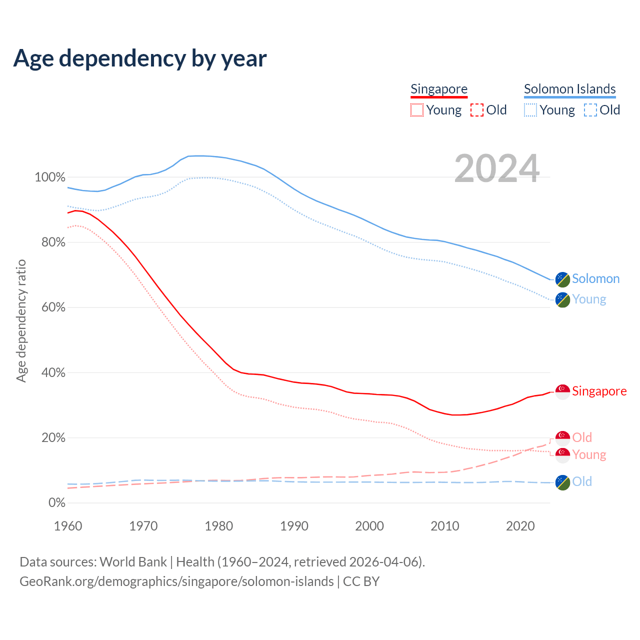 - Singapore is ranked 68/196 by median age (oldest to youngest) vs 153/196 for the Solomon Islands.