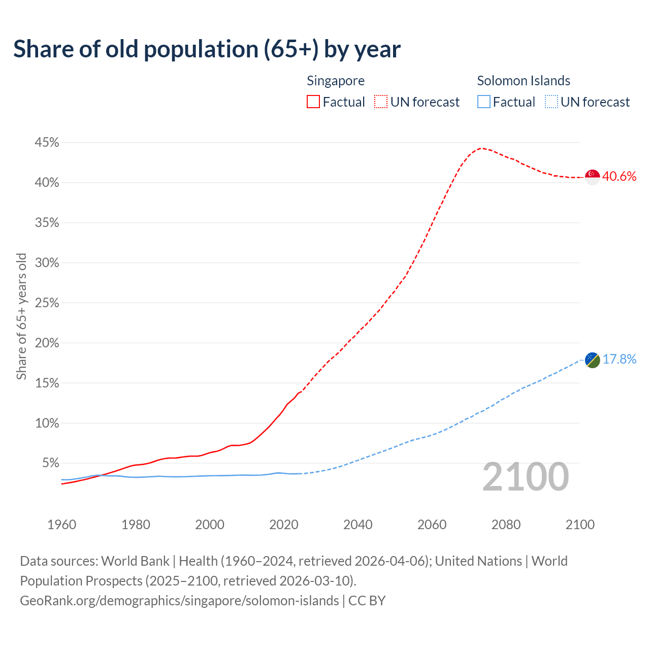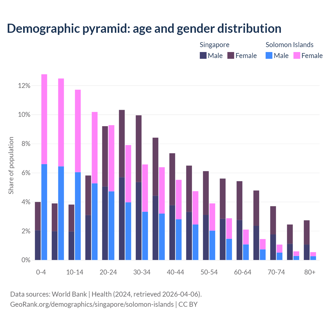 The share of older people aged 65 and over is 13.7% in Singapore and 3.64% in the Solomon Islands. Life expectancy in Singapore compared to the Solomon Islands .