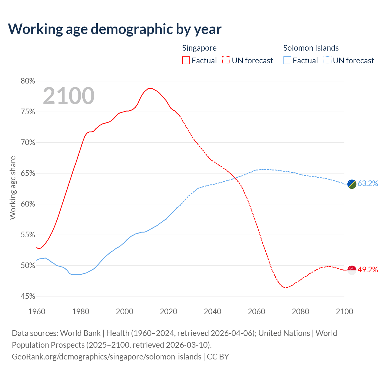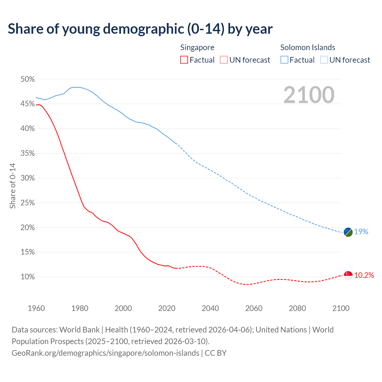 Median age Singapore vs Solomon Islands, 1960-2100