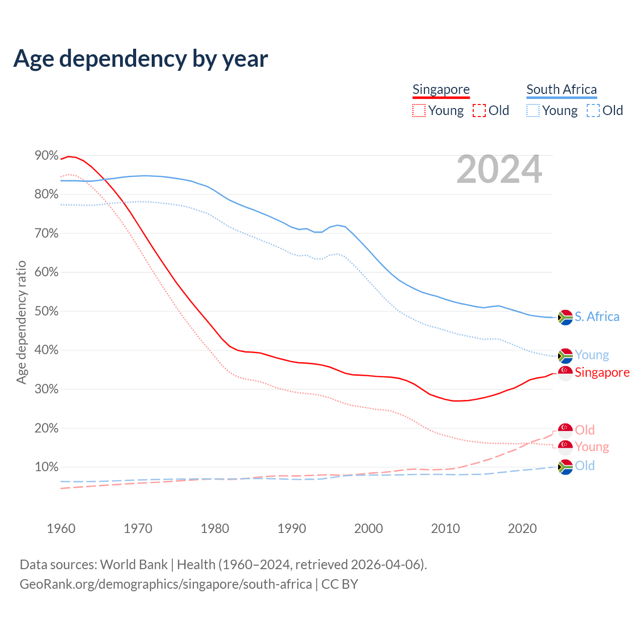 The share of older people aged 65 and over is 13.7% in Singapore and 6.69% in South Africa. Life expectancy in Singapore compared to South Africa .