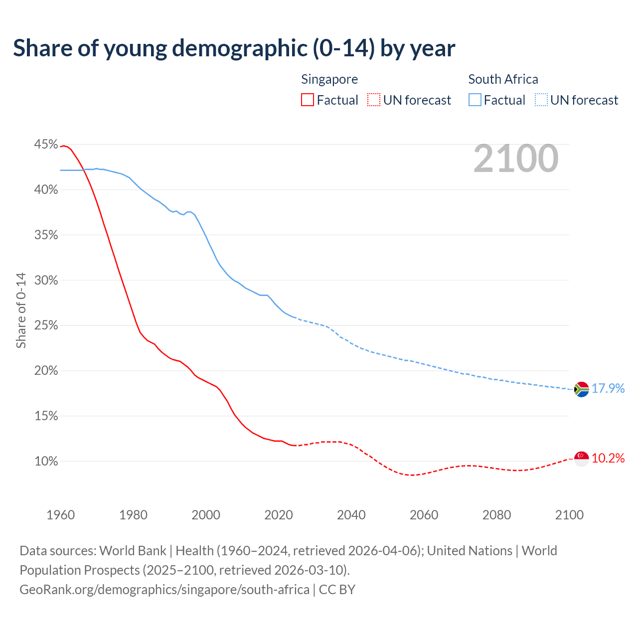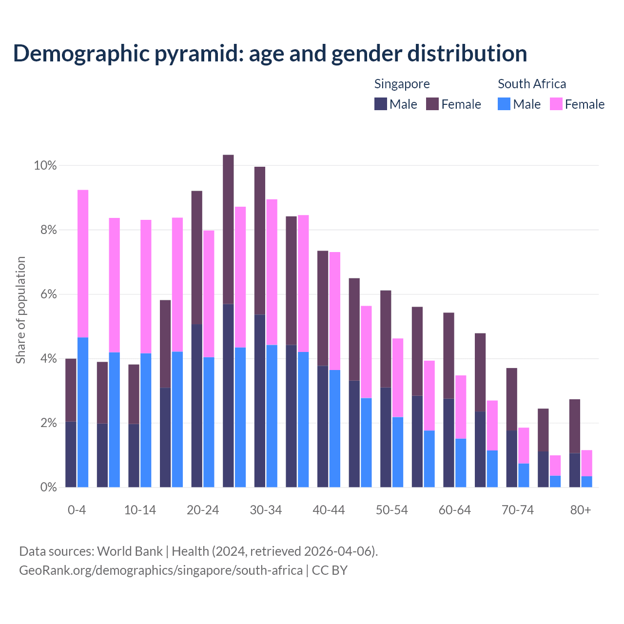 - As of 2026, the population of Singapore is 6.13M vs 65.7M in South Africa - 10.7 times difference.