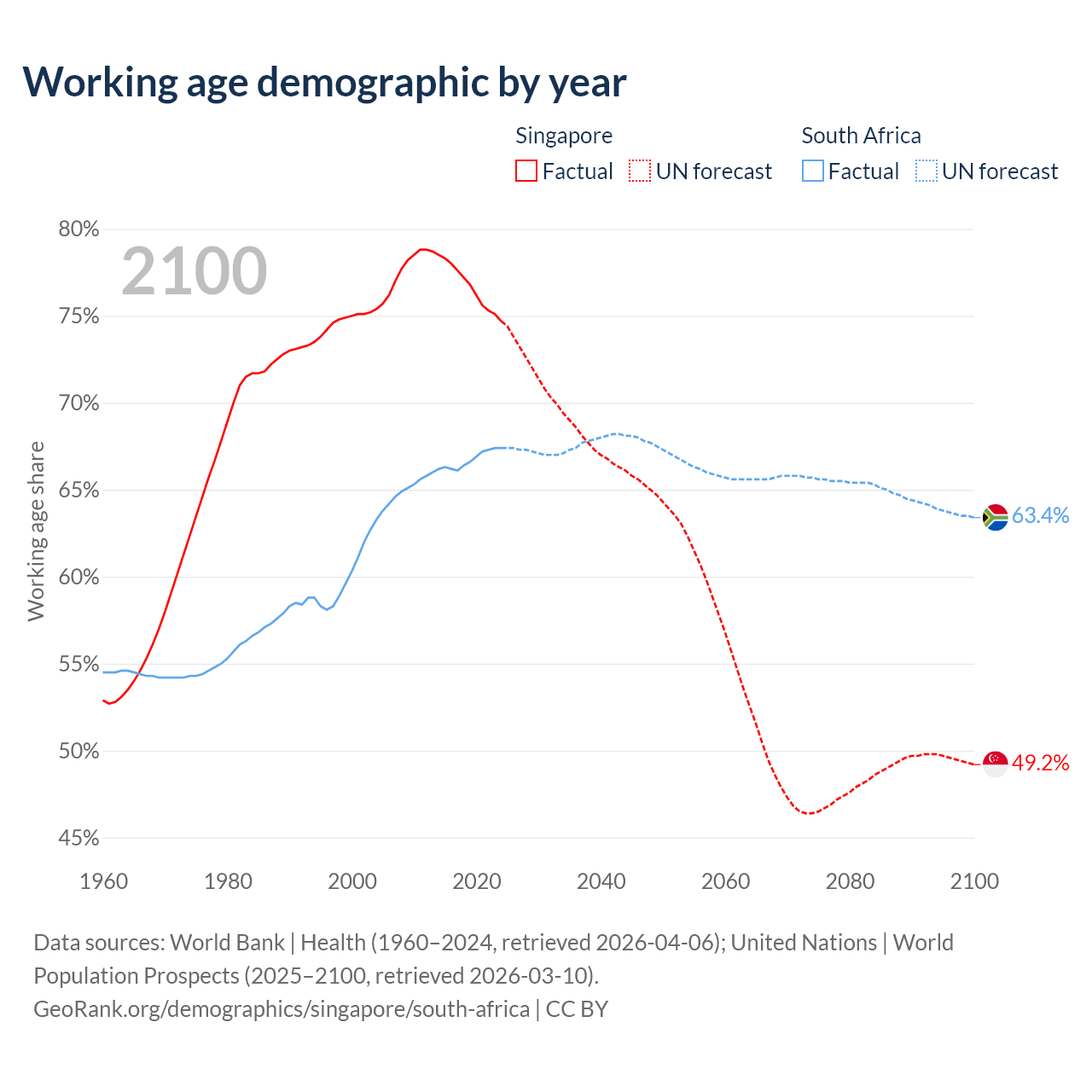 Median age Singapore vs South Africa, 1960-2100