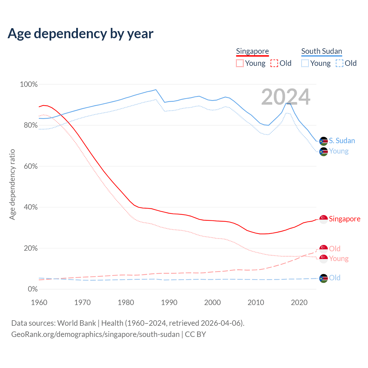 Data sources: World Bank | Health (1960–2024, retrieved 2026-04-06); U.S. Census Bureau (1960–2024, retrieved 2026-02-08).