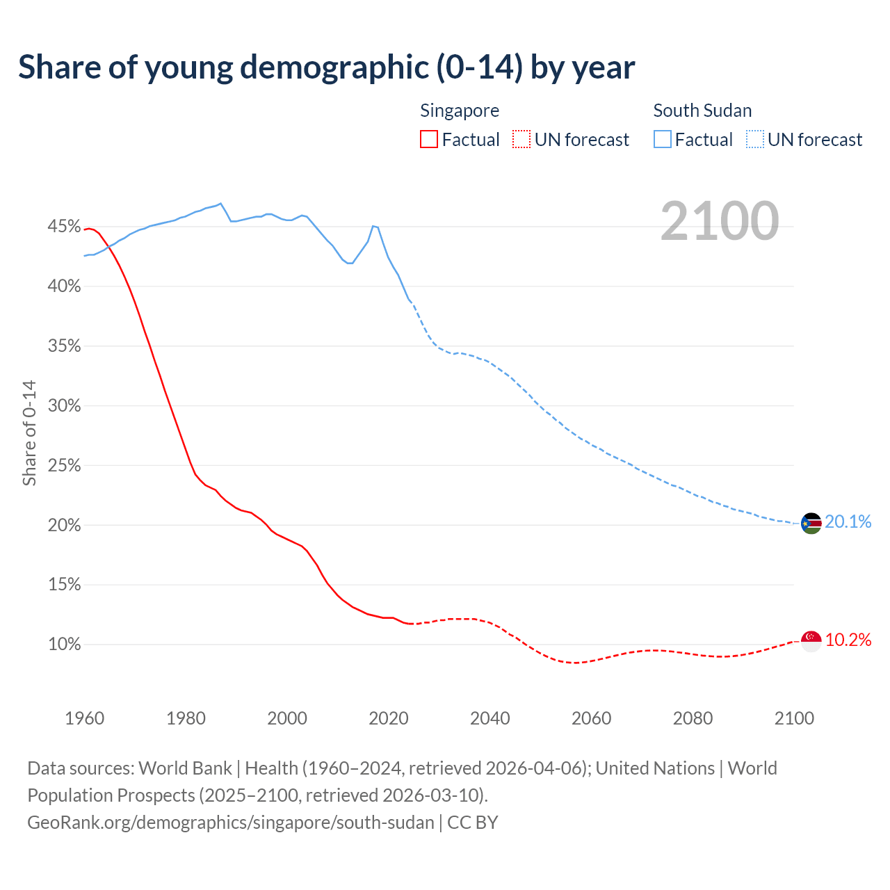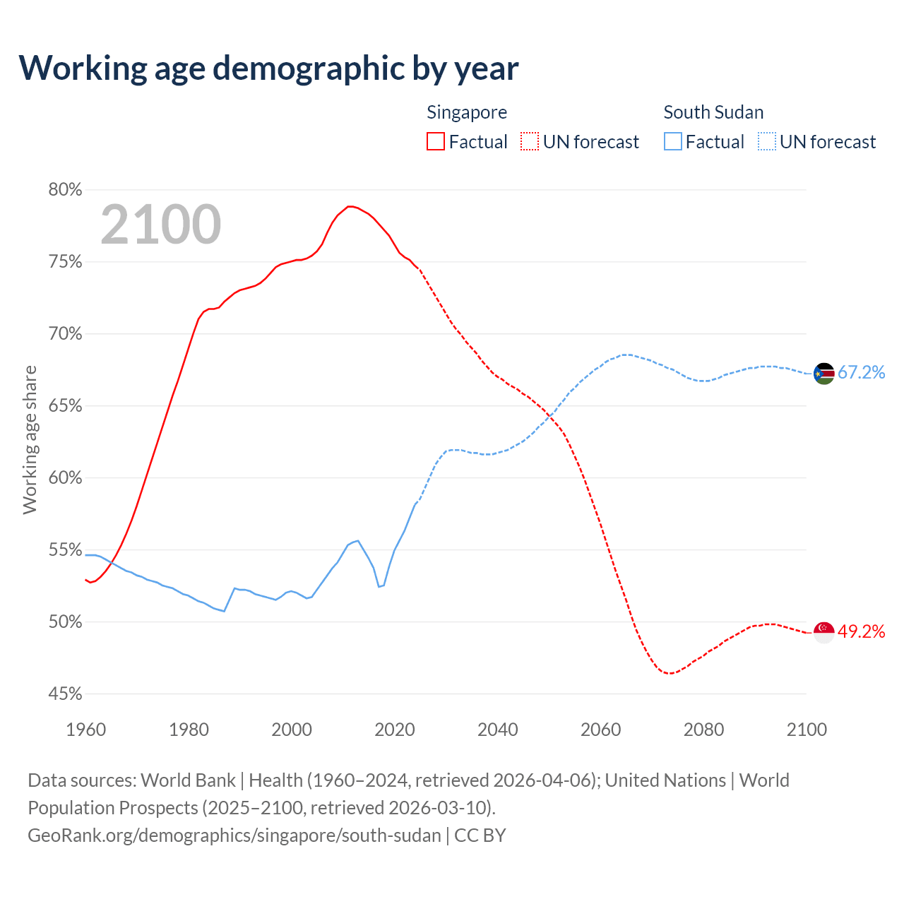 Median age Singapore vs South Sudan, 1960-2100