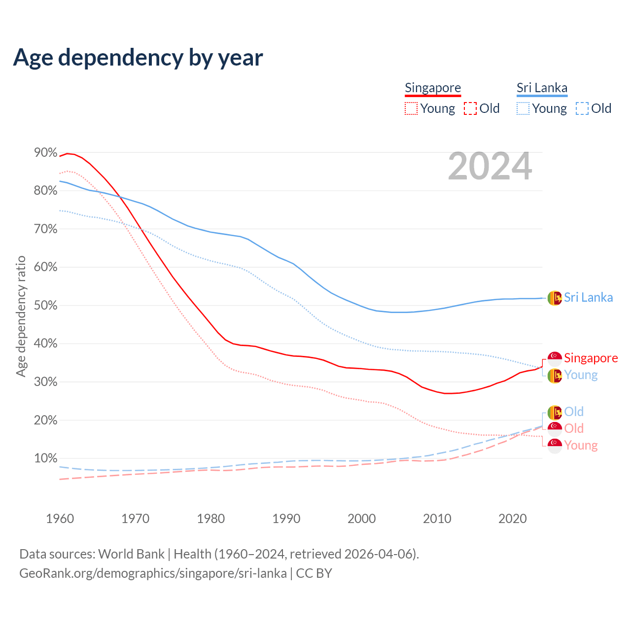 - Singapore is ranked 68/196 by median age (oldest to youngest) vs 81/196 for Sri Lanka.