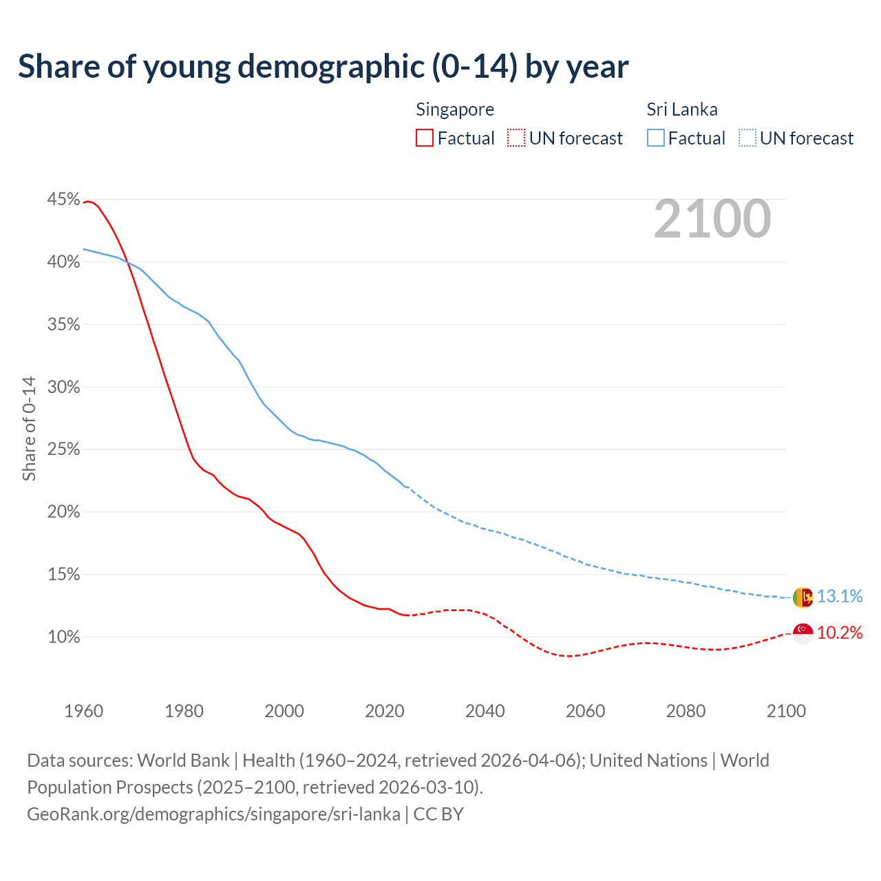 - As of 2026, the population of Singapore is 6.13M vs 22.2M in Sri Lanka - 3.62 times difference.