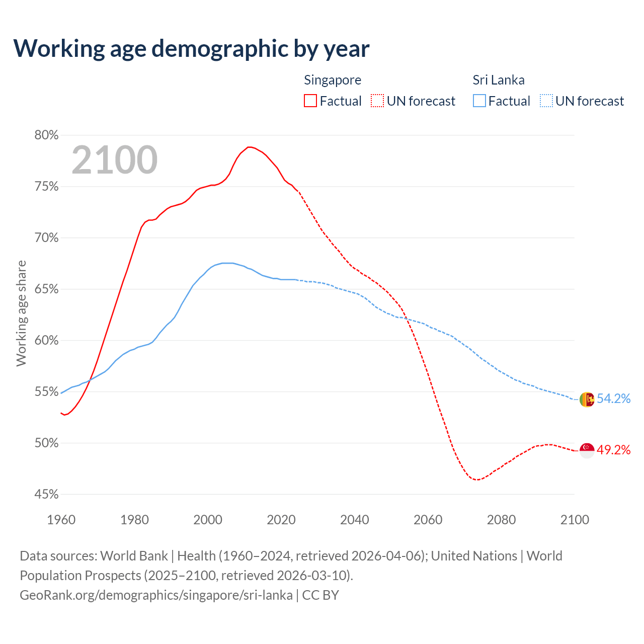 - Singapore has 4.57M working age adults (aged 15-64) vs 14.6M in Sri Lanka.
