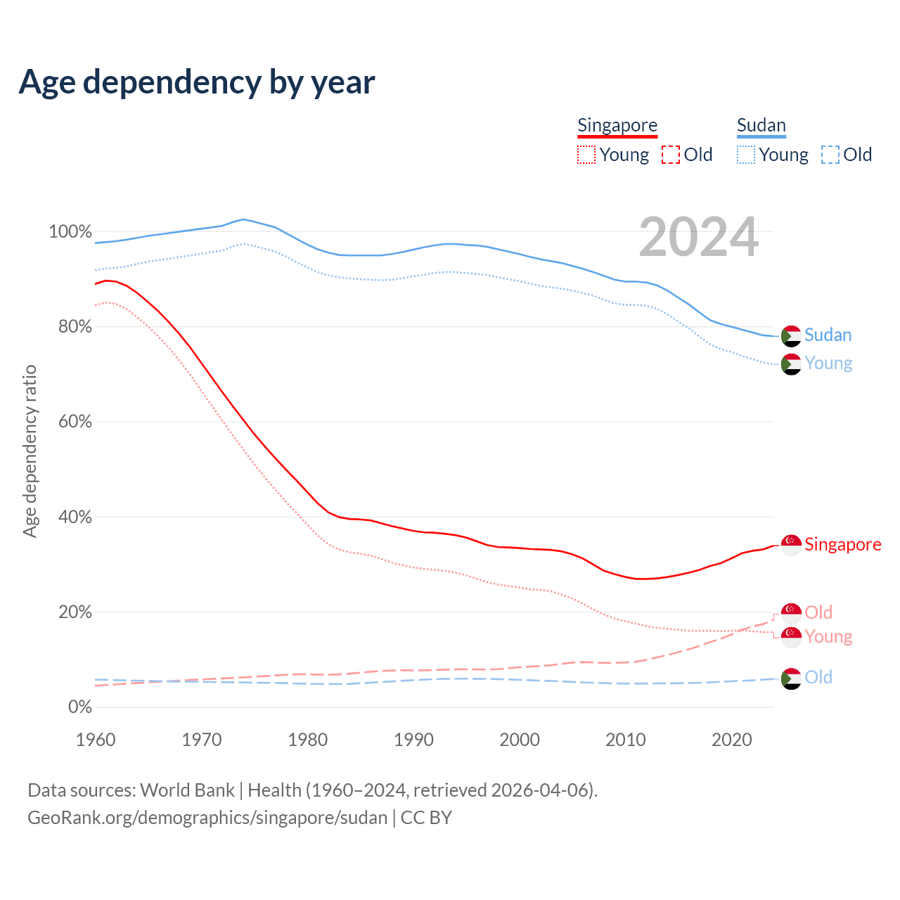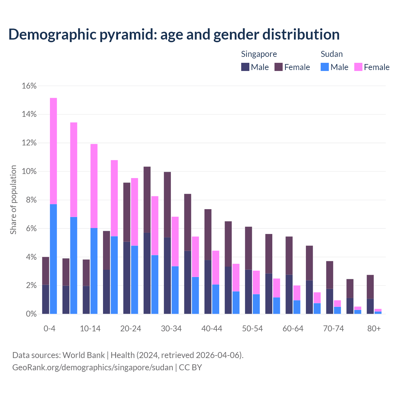 - Singapore is ranked 68/196 by median age (oldest to youngest) vs 172/196 for Sudan.