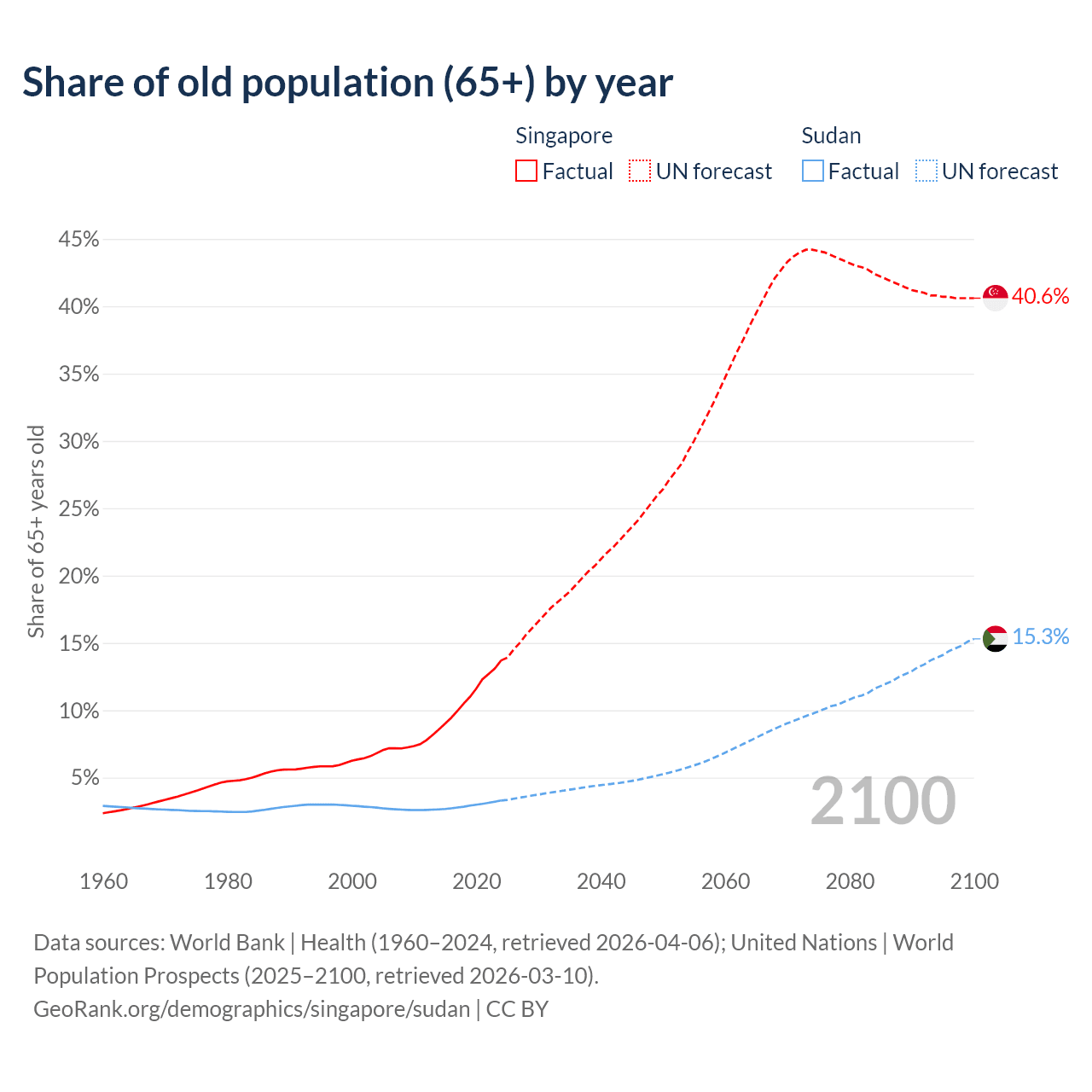 The share of older people aged 65 and over is 13.7% in Singapore and 3.3% in Sudan. Life expectancy in Singapore compared to Sudan .