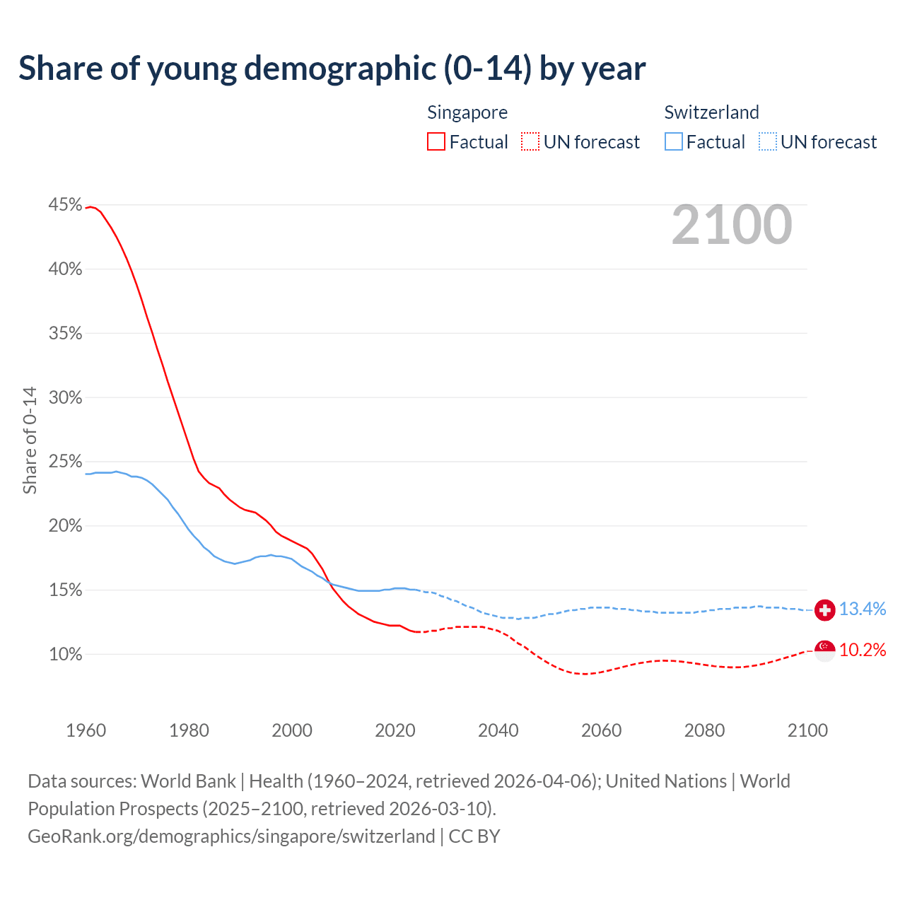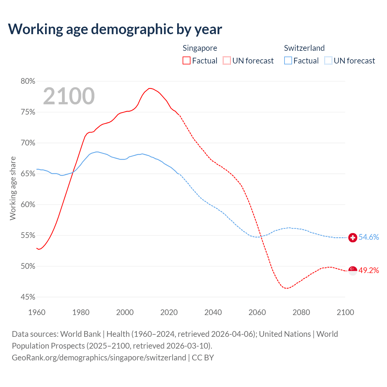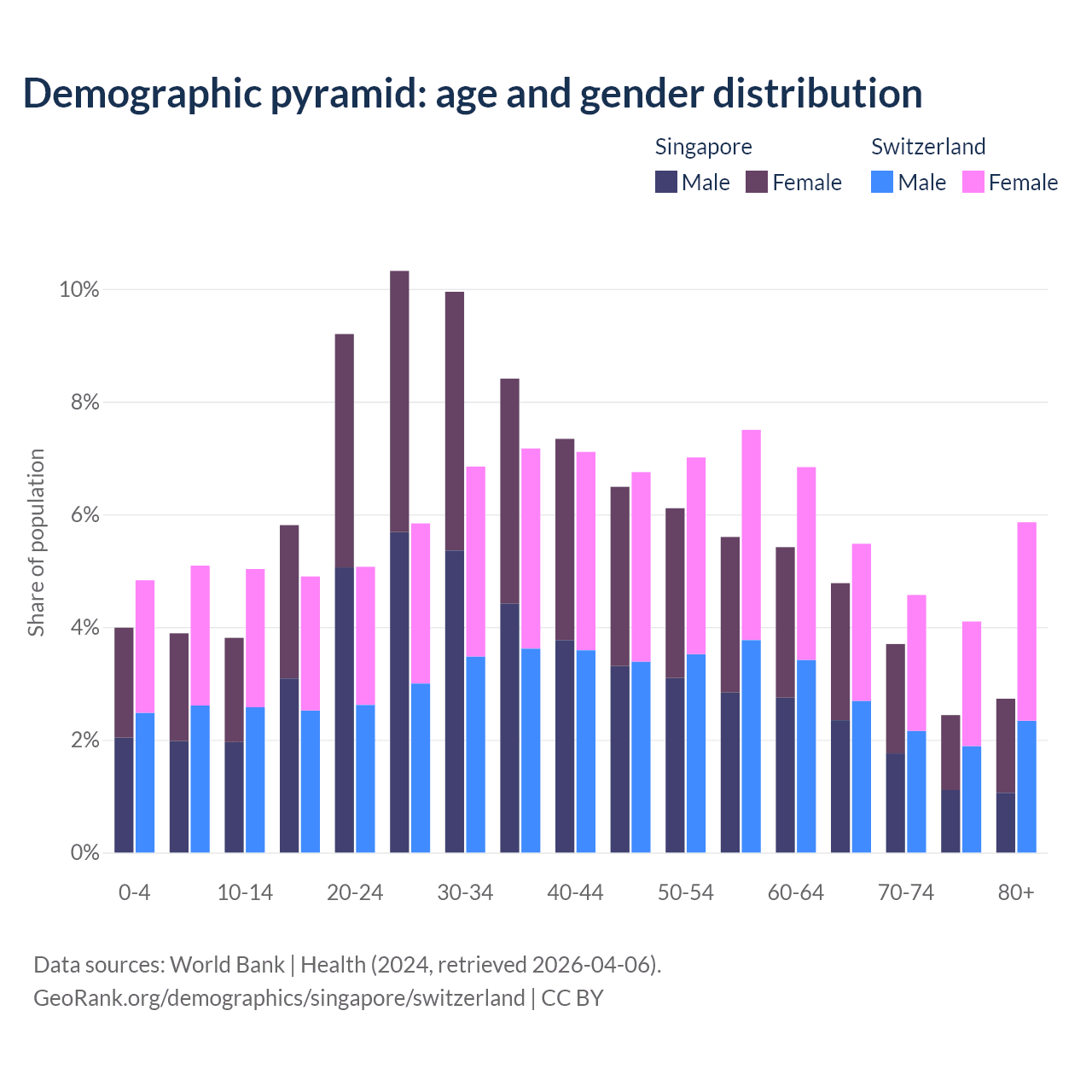 - Singapore is ranked 68/196 by median age (oldest to youngest) vs 24/196 for Switzerland.