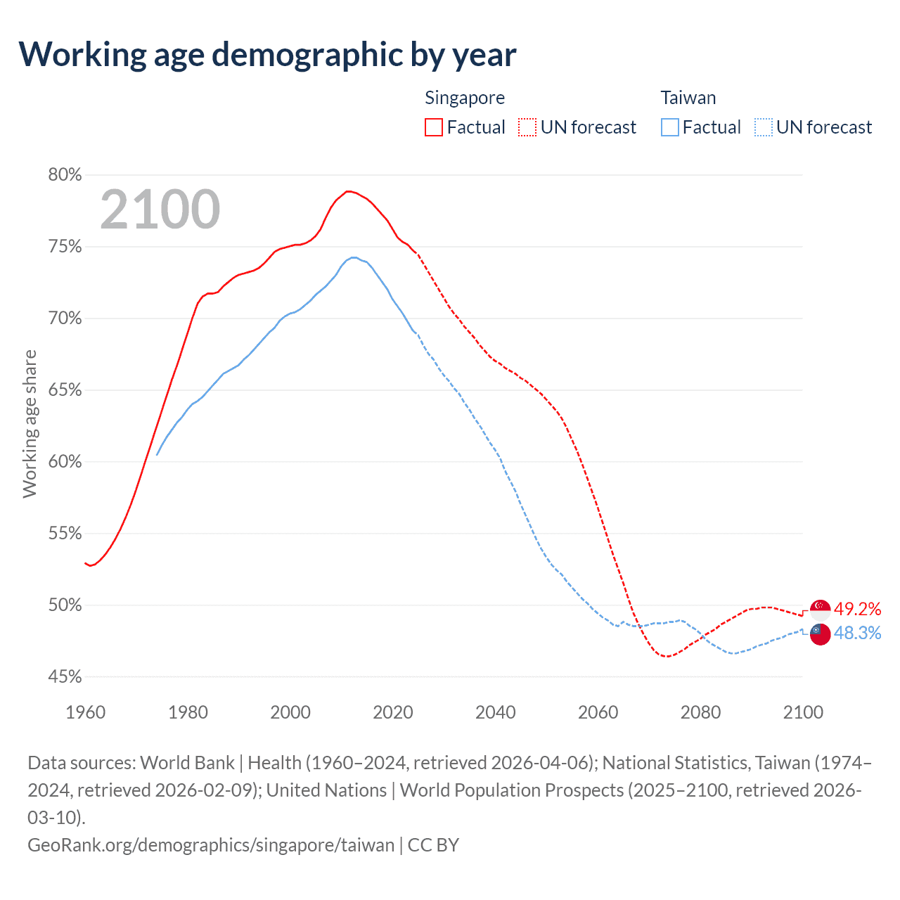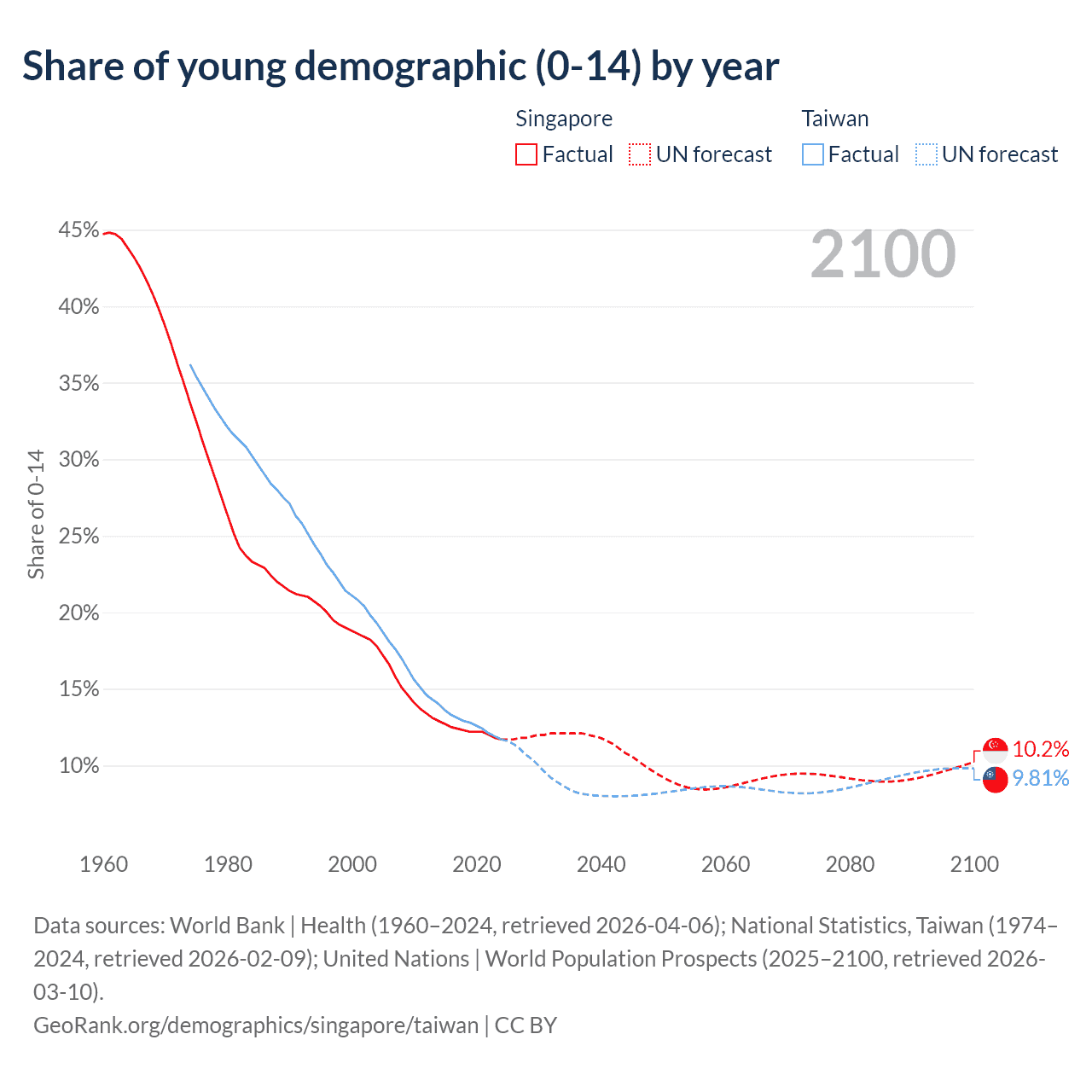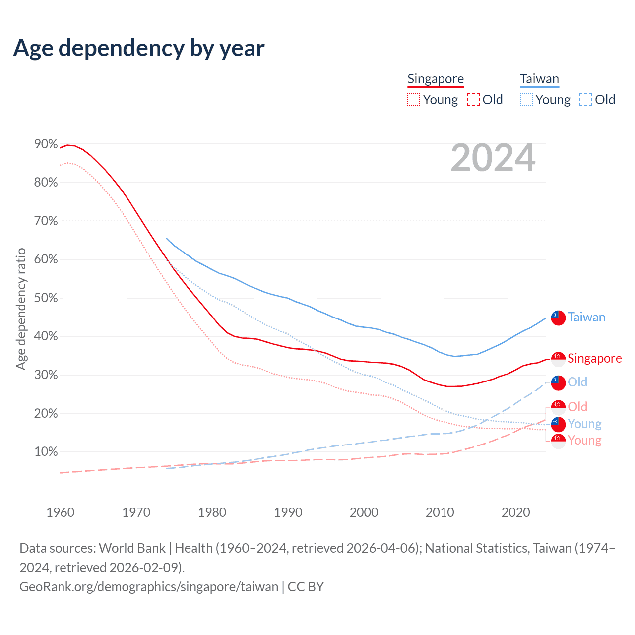 Data sources: World Bank | Health (1960–2024, retrieved 2026-04-06); U.S. Census Bureau (1960–2024, retrieved 2026-02-08); National Statistics, Taiwan (1974–2024, retrieved 2026-02-09).