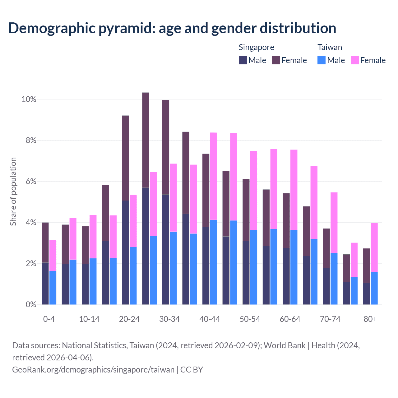 - Singapore is ranked 68/196 by median age (oldest to youngest) vs 16/196 for Taiwan.