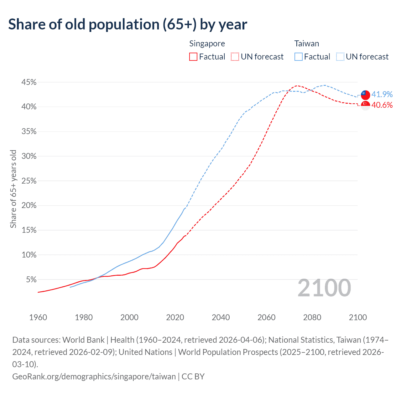 Median age Singapore vs Taiwan, 1960-2100