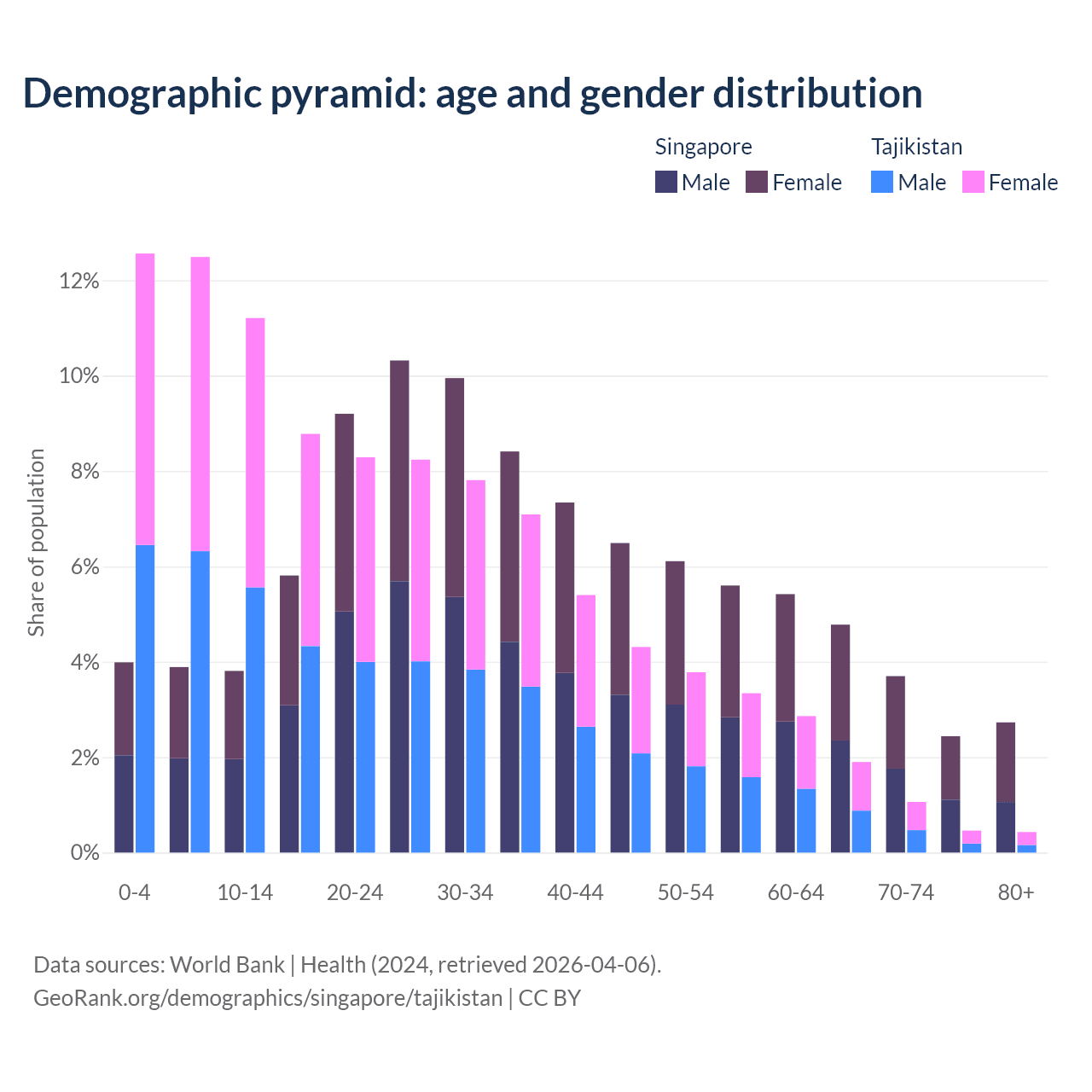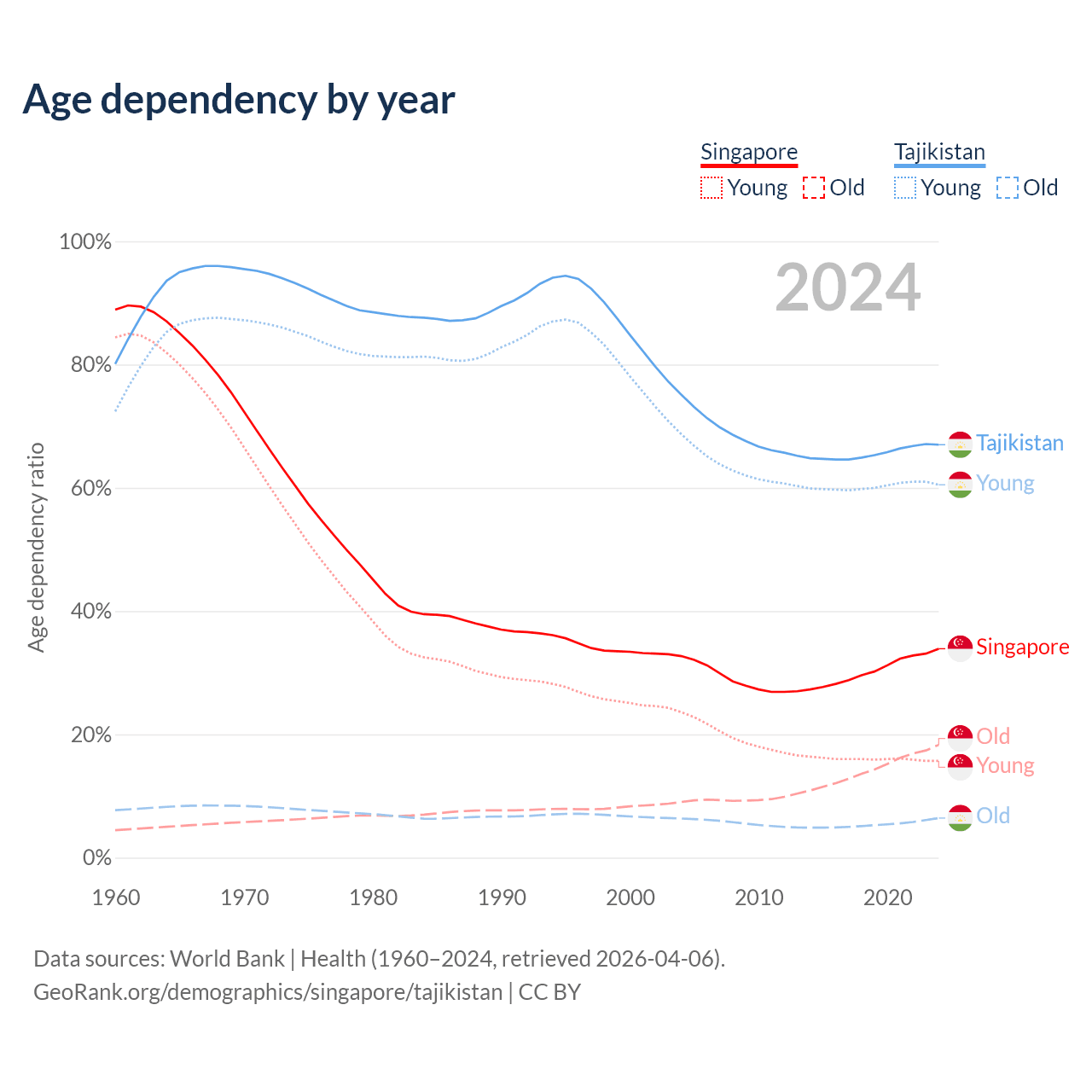 The share of older people aged 65 and over is 13.7% in Singapore and 3.85% in Tajikistan. Life expectancy in Singapore compared to Tajikistan .