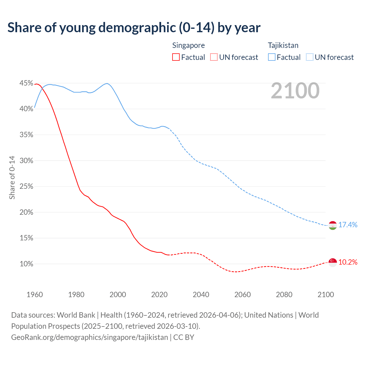 - As of 2026, the population of Singapore is 6.13M vs 11M in Tajikistan - 1.8 times difference.