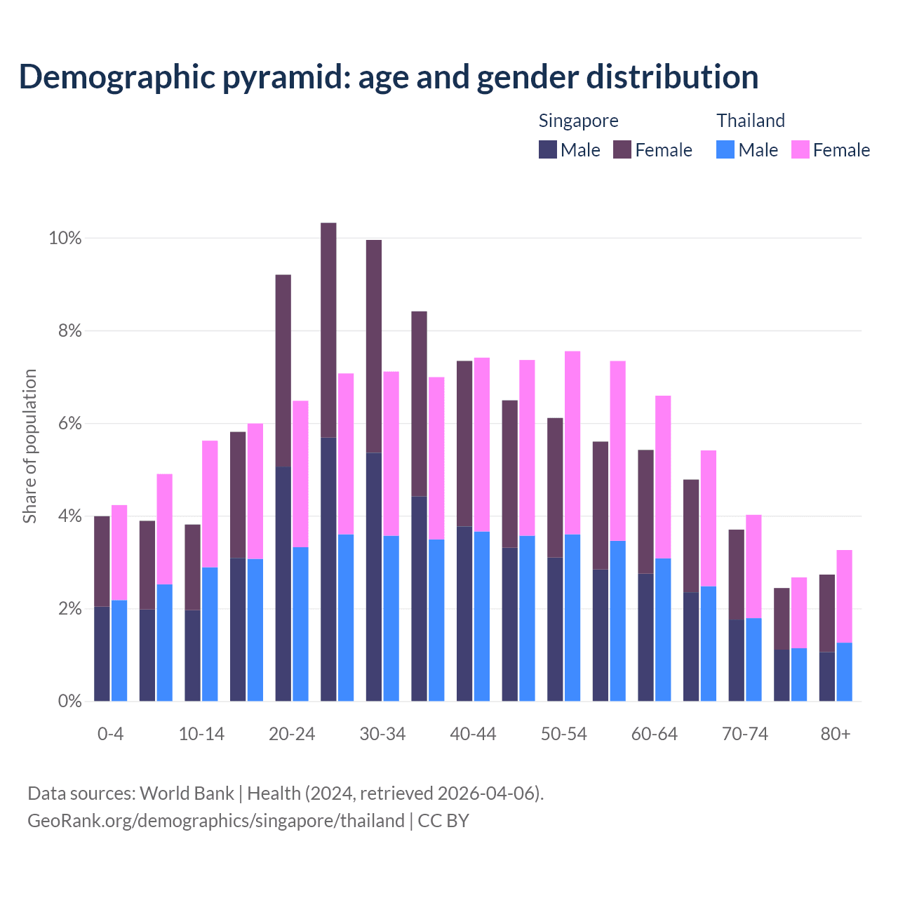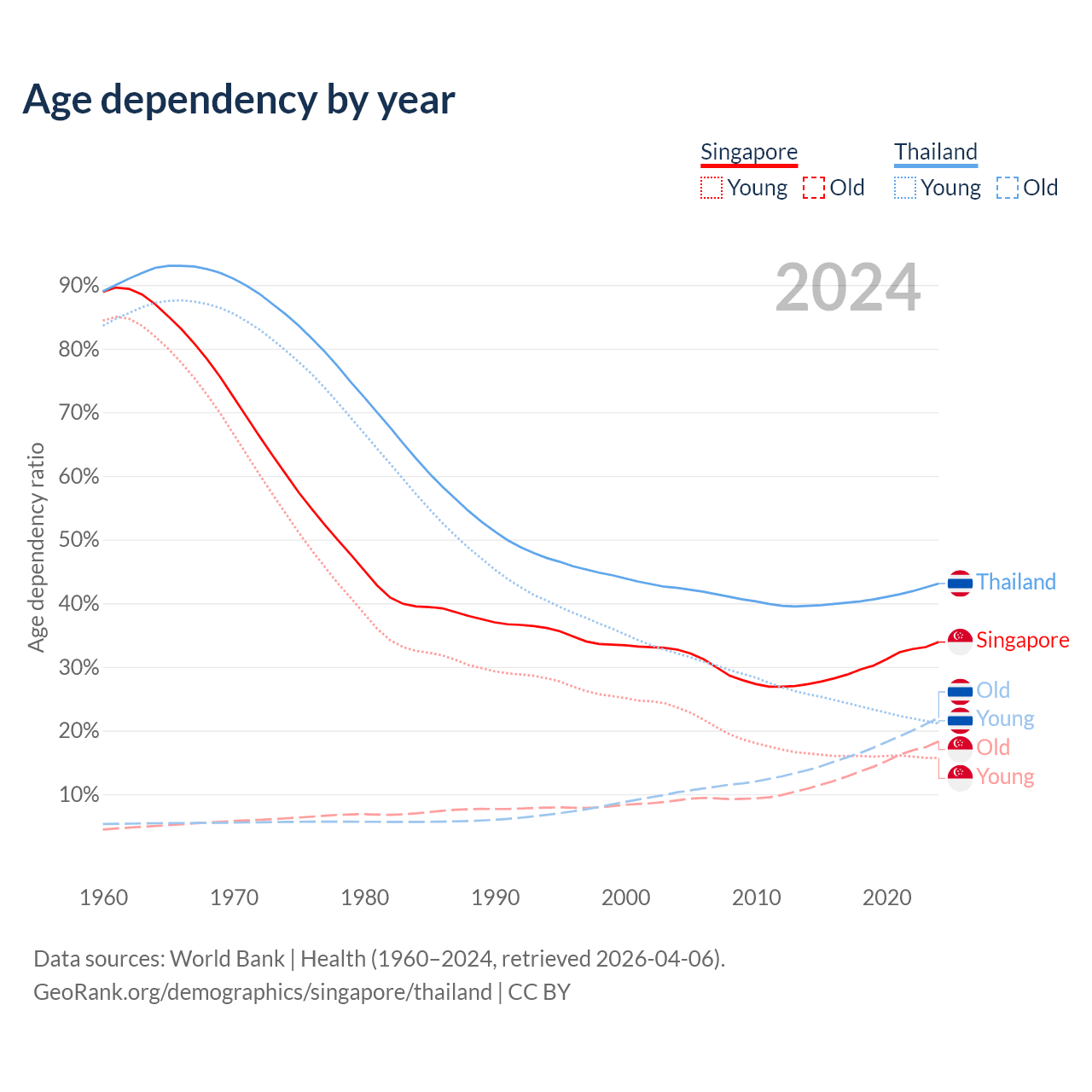 - Singapore is ranked 68/196 by median age (oldest to youngest) vs 40/196 for Thailand.