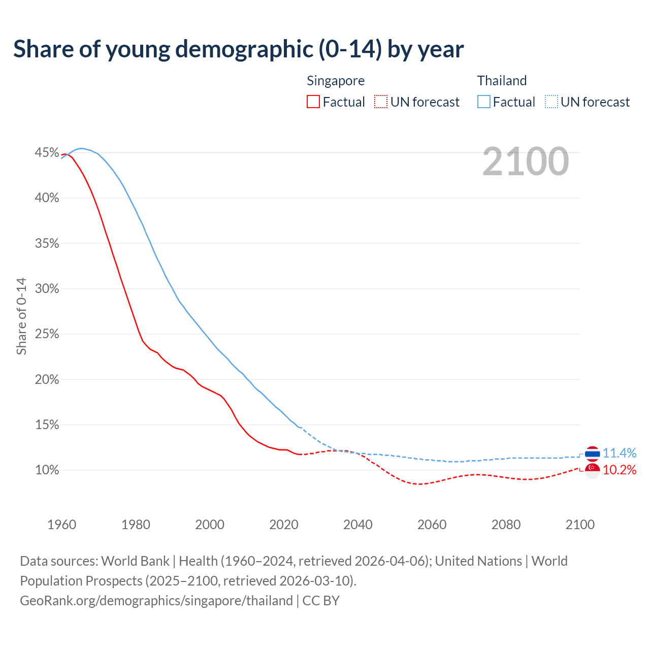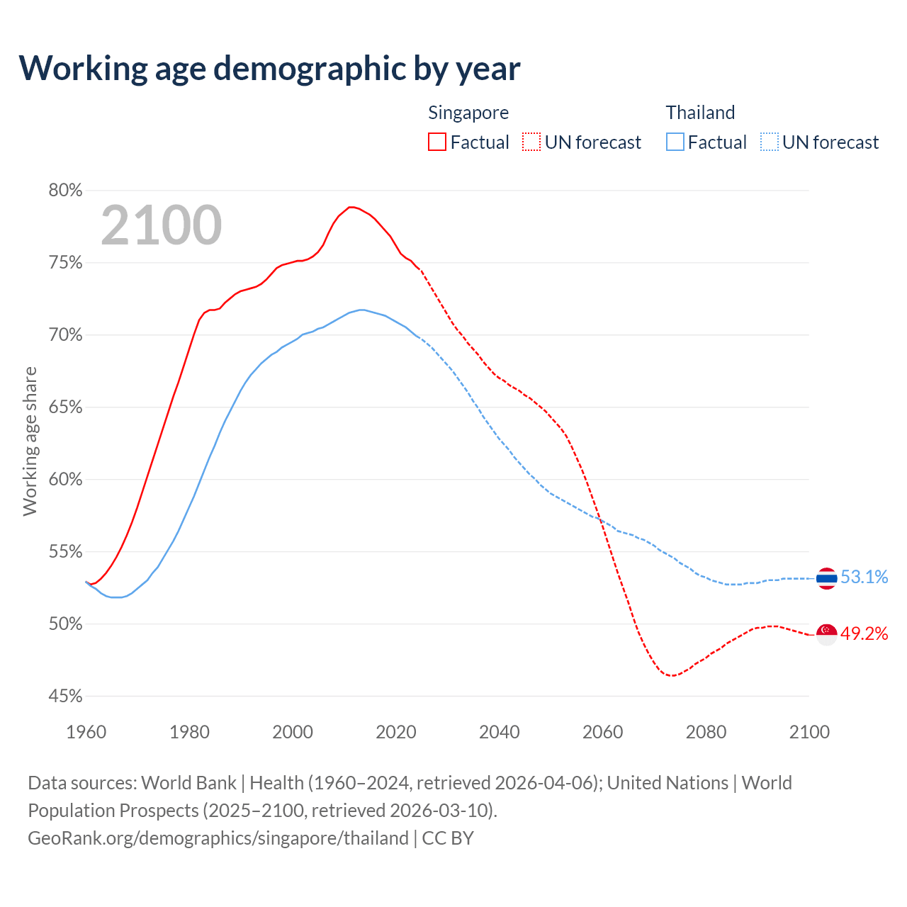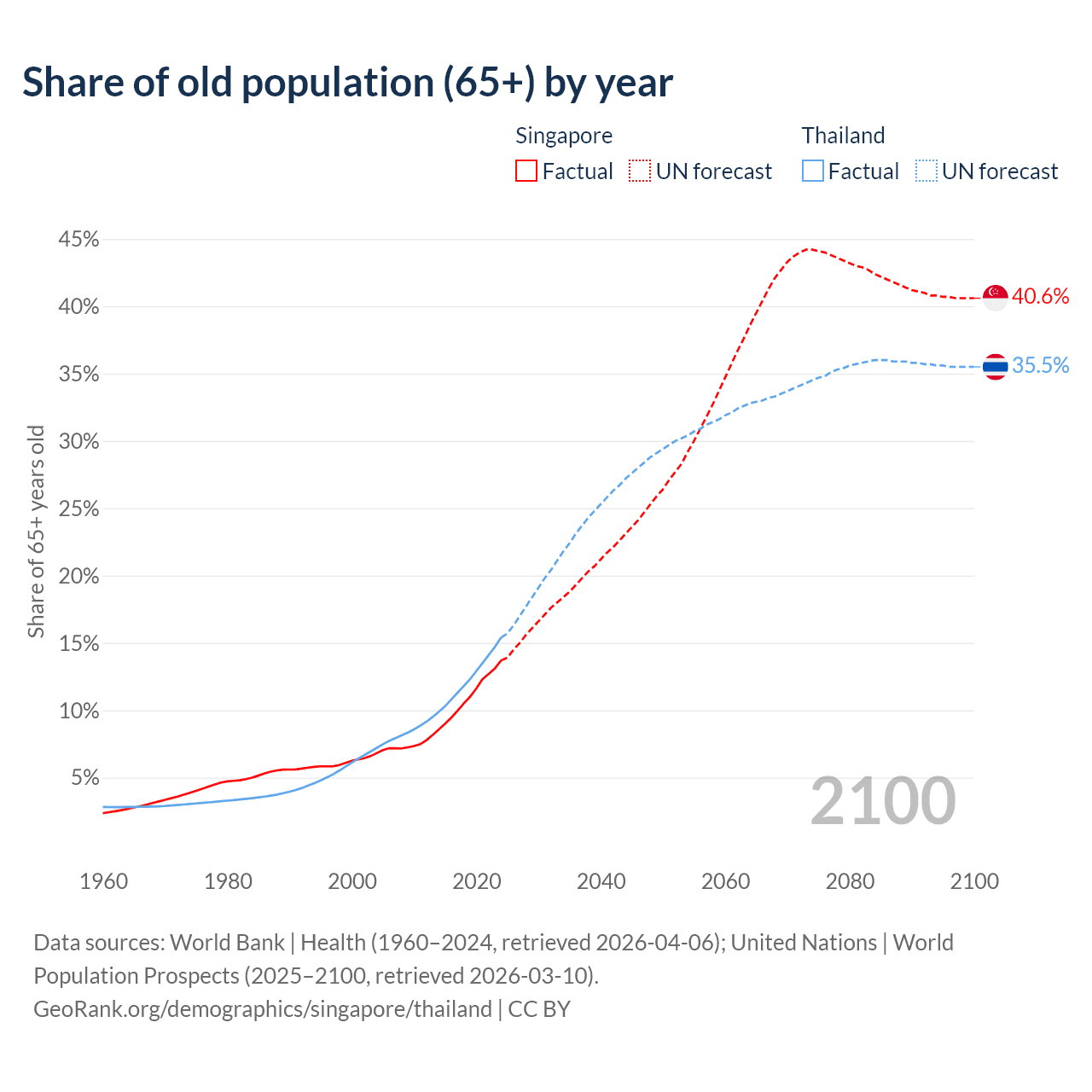 Median age Singapore vs Thailand, 1960-2100
