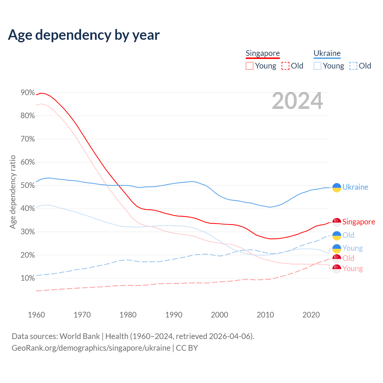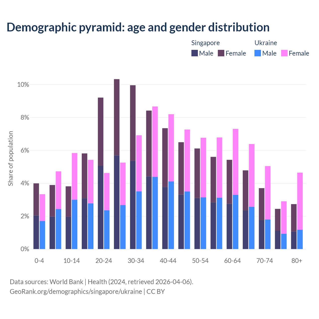 - Singapore is ranked 68/196 by median age (oldest to youngest) vs 26/196 for Ukraine.