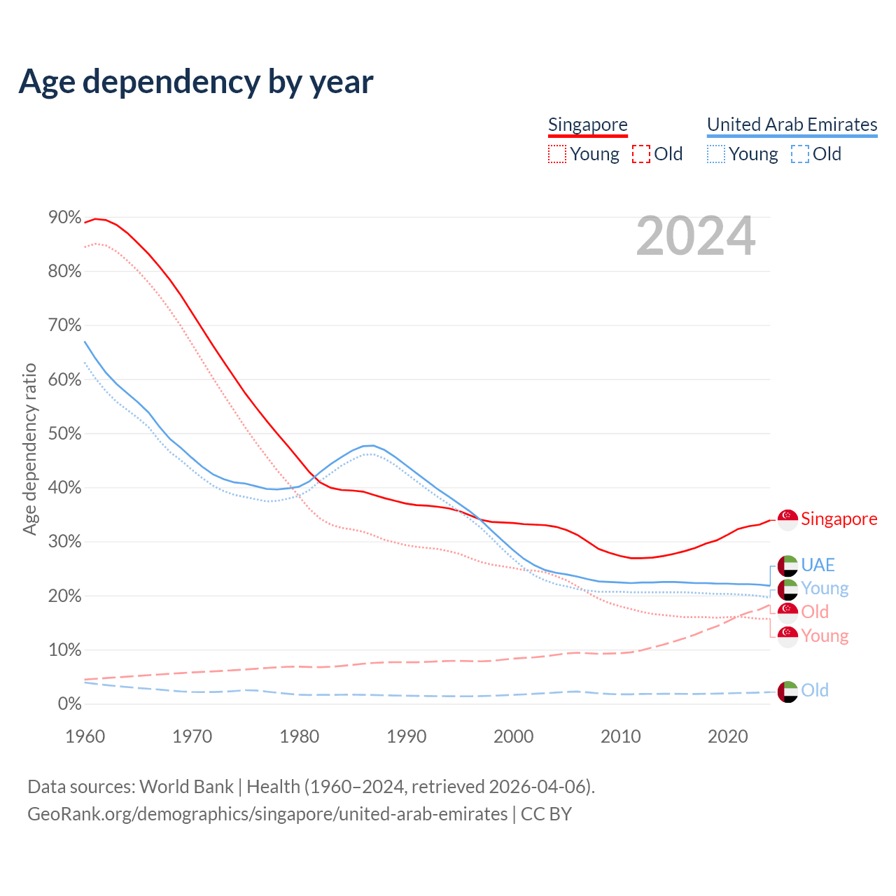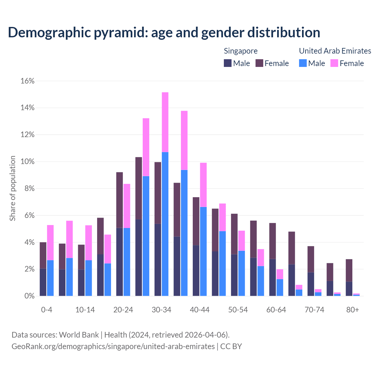 - Singapore is ranked 68/196 by median age (oldest to youngest) vs 91/196 for the United Arab Emirates.