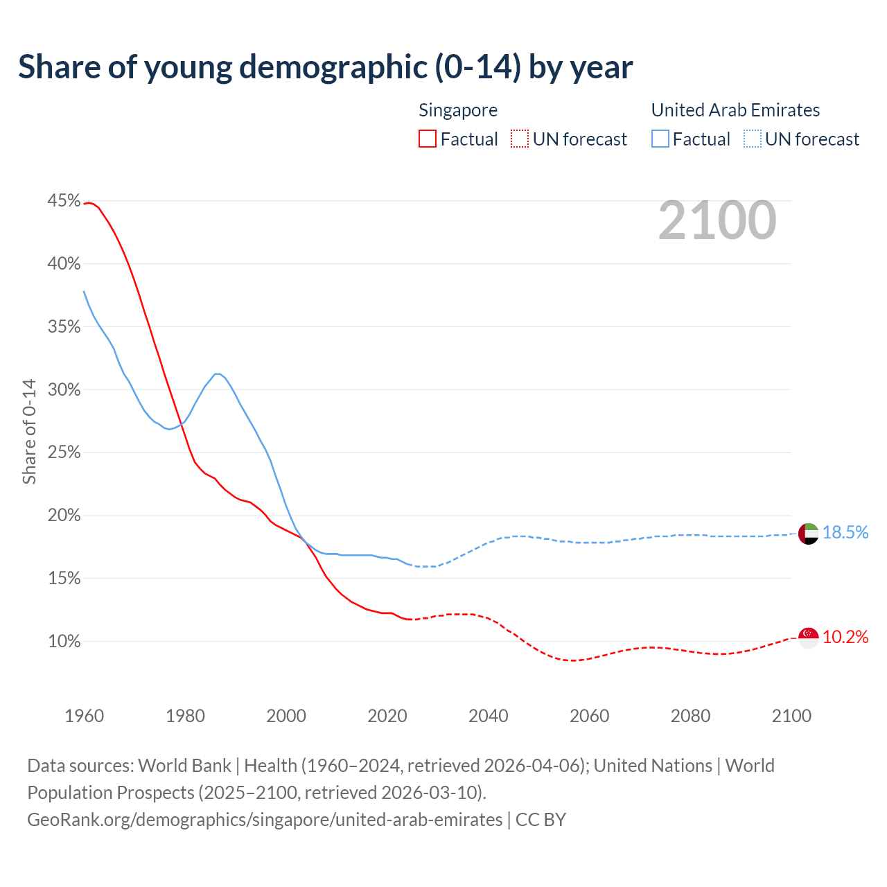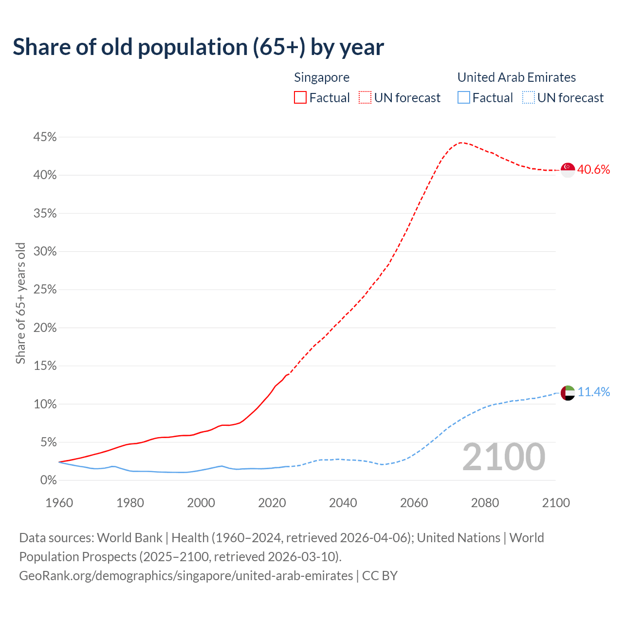 The share of older people aged 65 and over is 13.7% in Singapore and 1.77% in the United Arab Emirates. Life expectancy in Singapore compared to the United Arab Emirates .