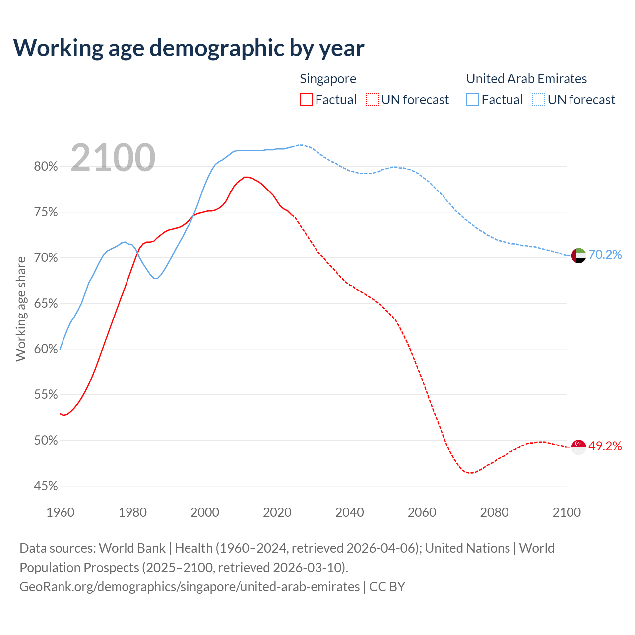 - Singapore has 4.57M working age adults (aged 15-64) vs 9.6M in the United Arab Emirates.