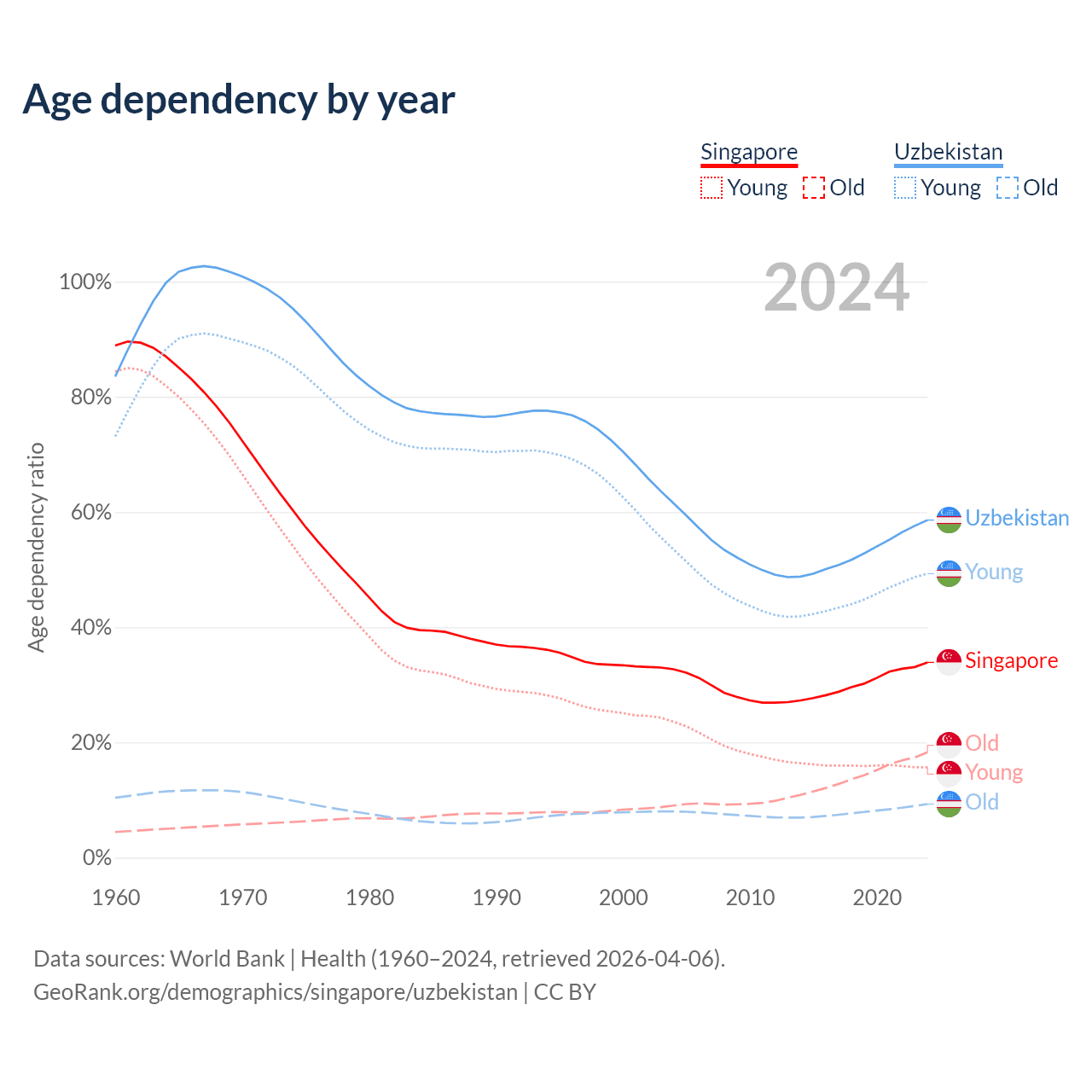 The share of older people aged 65 and over is 13.7% in Singapore and 5.86% in Uzbekistan. Life expectancy in Singapore compared to Uzbekistan .