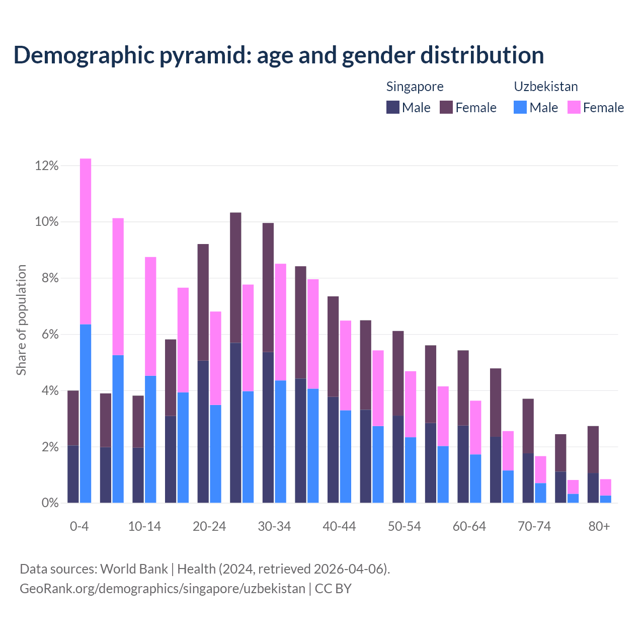 - Singapore is ranked 68/196 by median age (oldest to youngest) vs 116/196 for Uzbekistan.