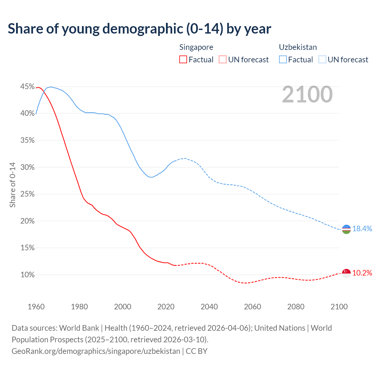 - The share of young demographic (0-15 years old) in Singapore is 11.7% vs 31.1% in Uzbekistan.