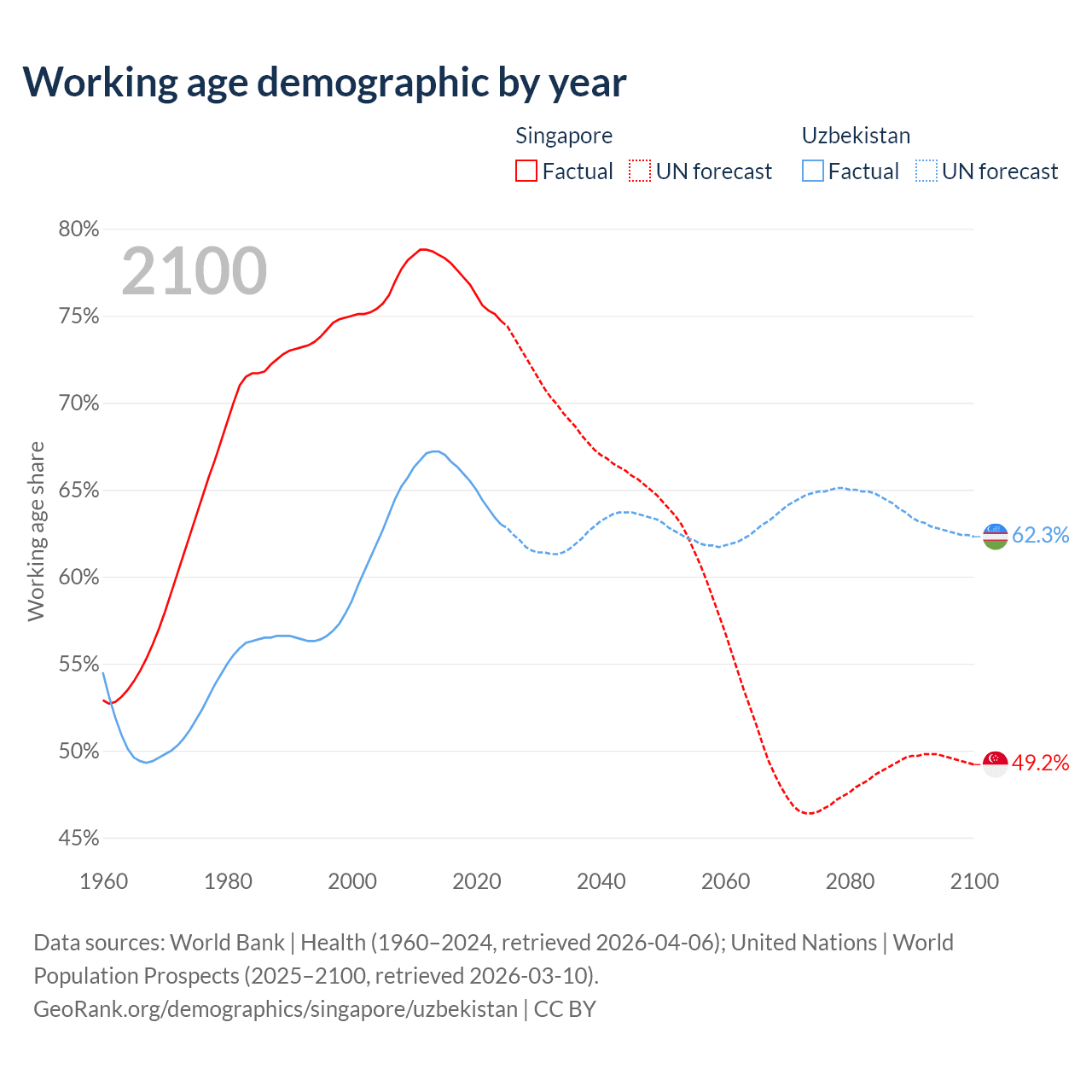 - Singapore has 4.57M working age adults (aged 15-64) vs 23.9M in Uzbekistan.
