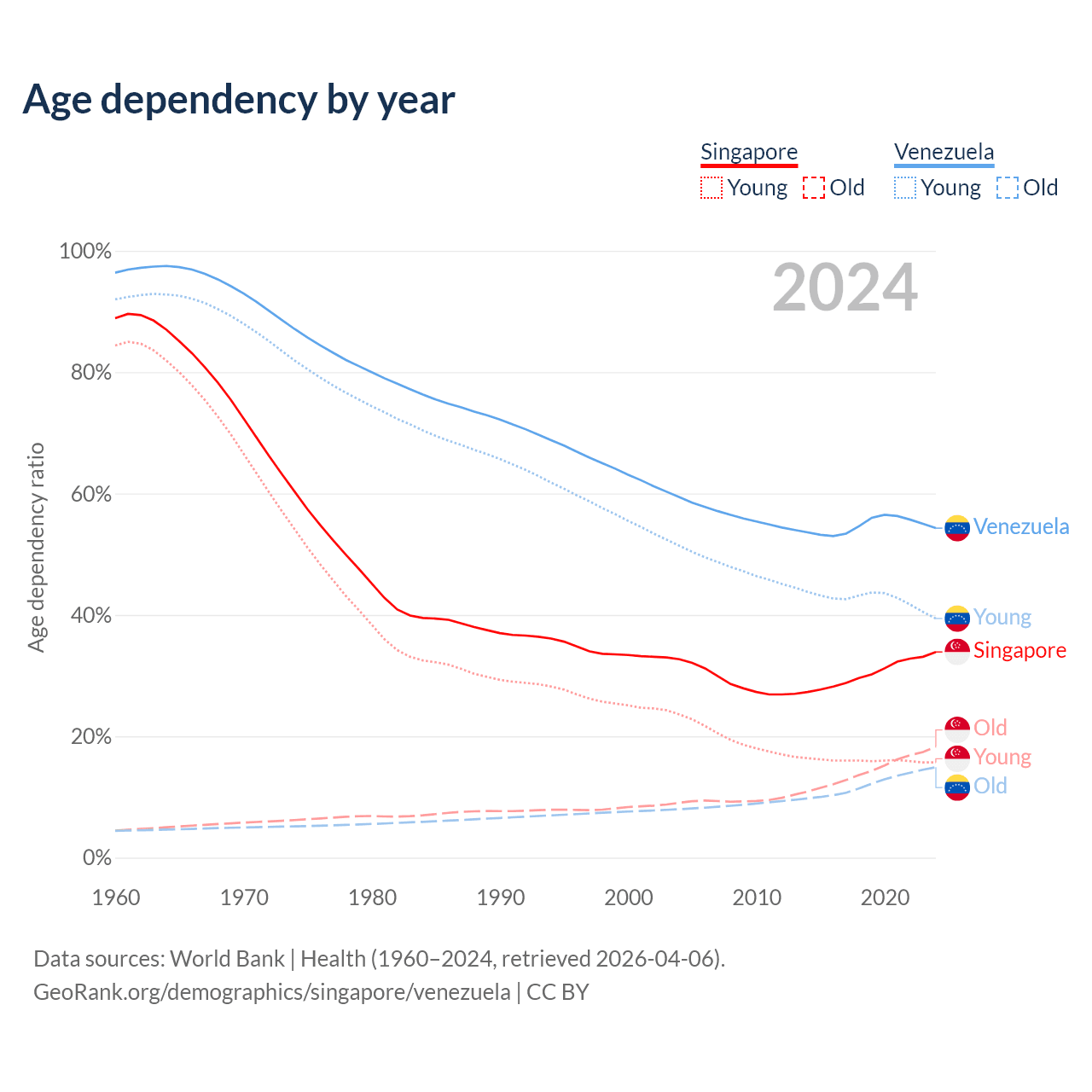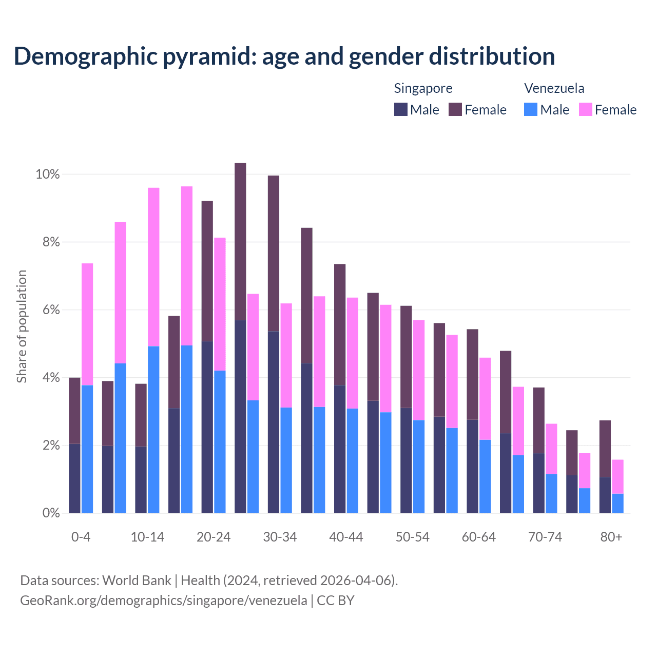 - Singapore is ranked 68/196 by median age (oldest to youngest) vs 104/196 for Venezuela.