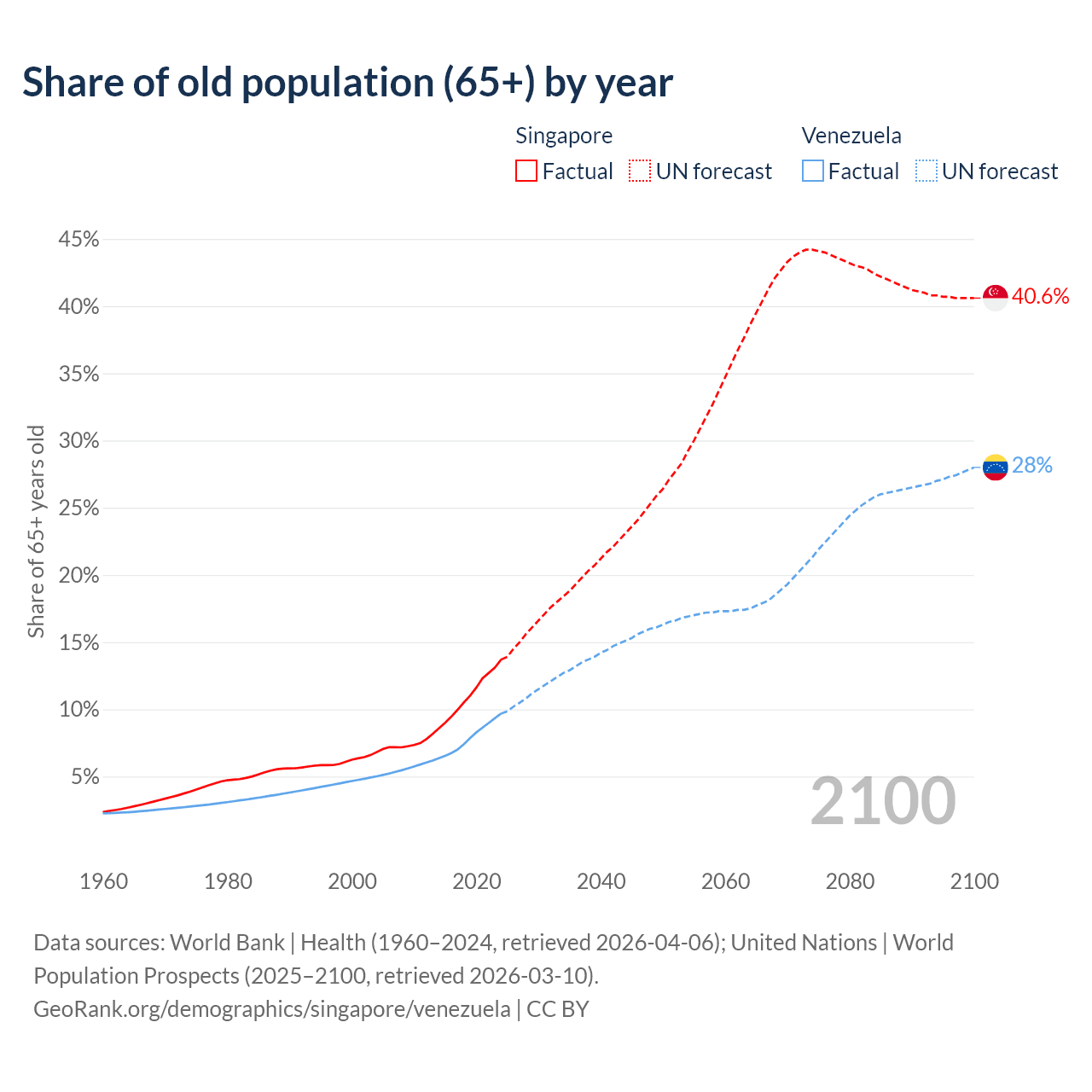 The share of older people aged 65 and over is 13.7% in Singapore and 9.68% in Venezuela. Life expectancy in Singapore compared to Venezuela .