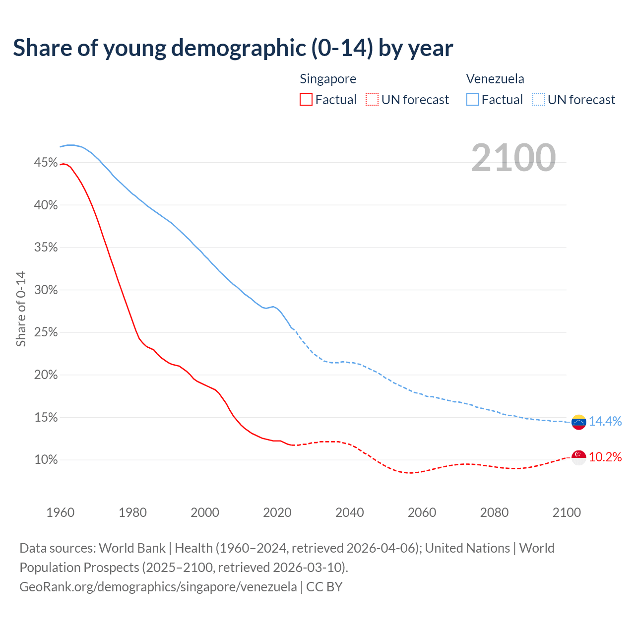 - The share of young demographic (0-15 years old) in Singapore is 11.7% vs 25.5% in Venezuela.