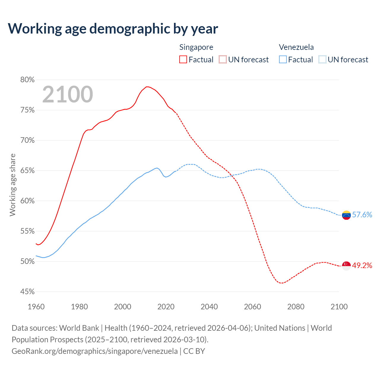 - Singapore has 4.57M working age adults (aged 15-64) vs 18.6M in Venezuela.