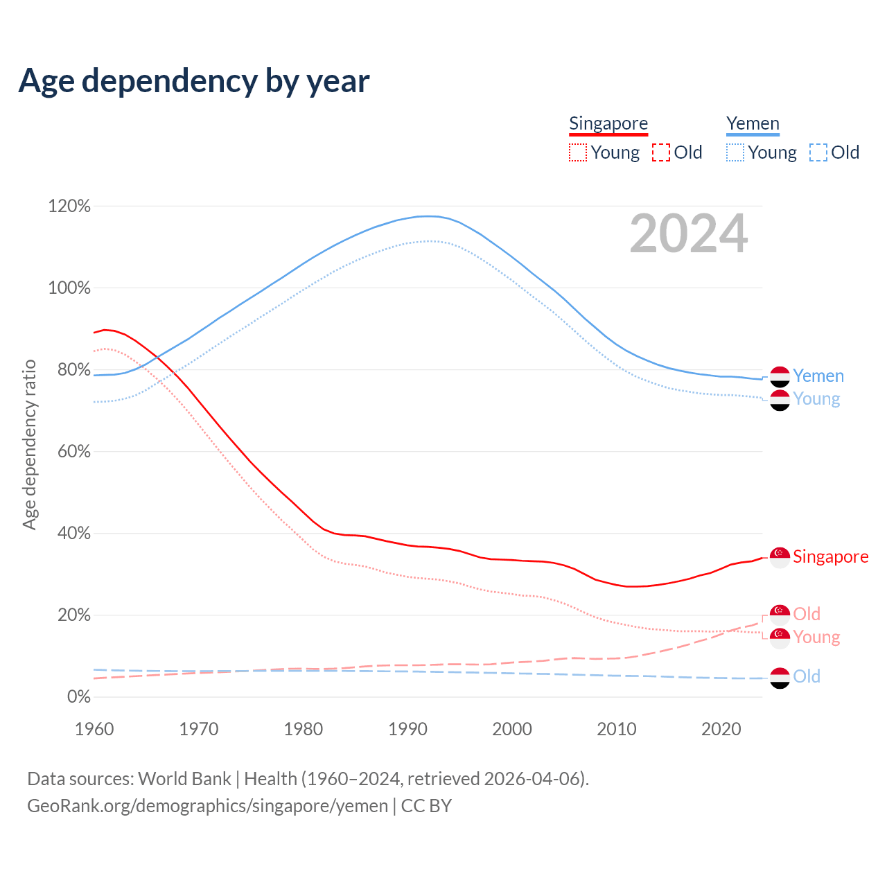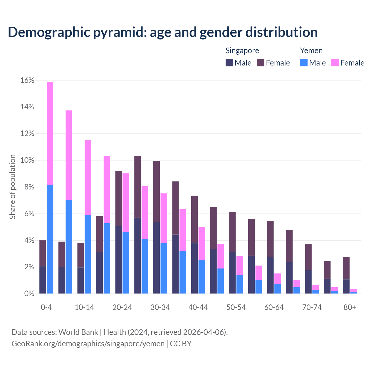The share of older people aged 65 and over is 13.7% in Singapore and 2.52% in Yemen. Life expectancy in Singapore compared to Yemen .