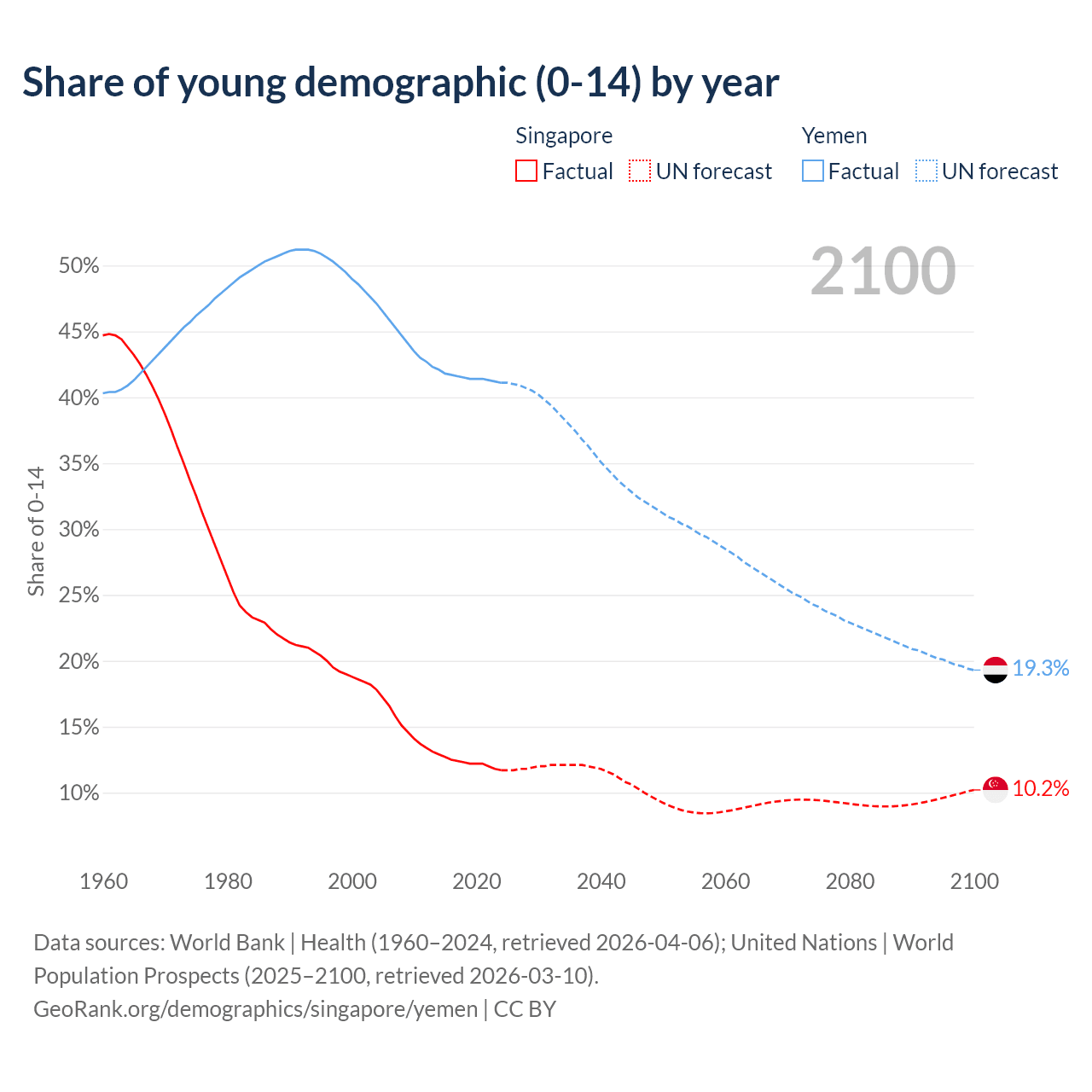 - The share of young demographic (0-15 years old) in Singapore is 11.7% vs 41.1% in Yemen.