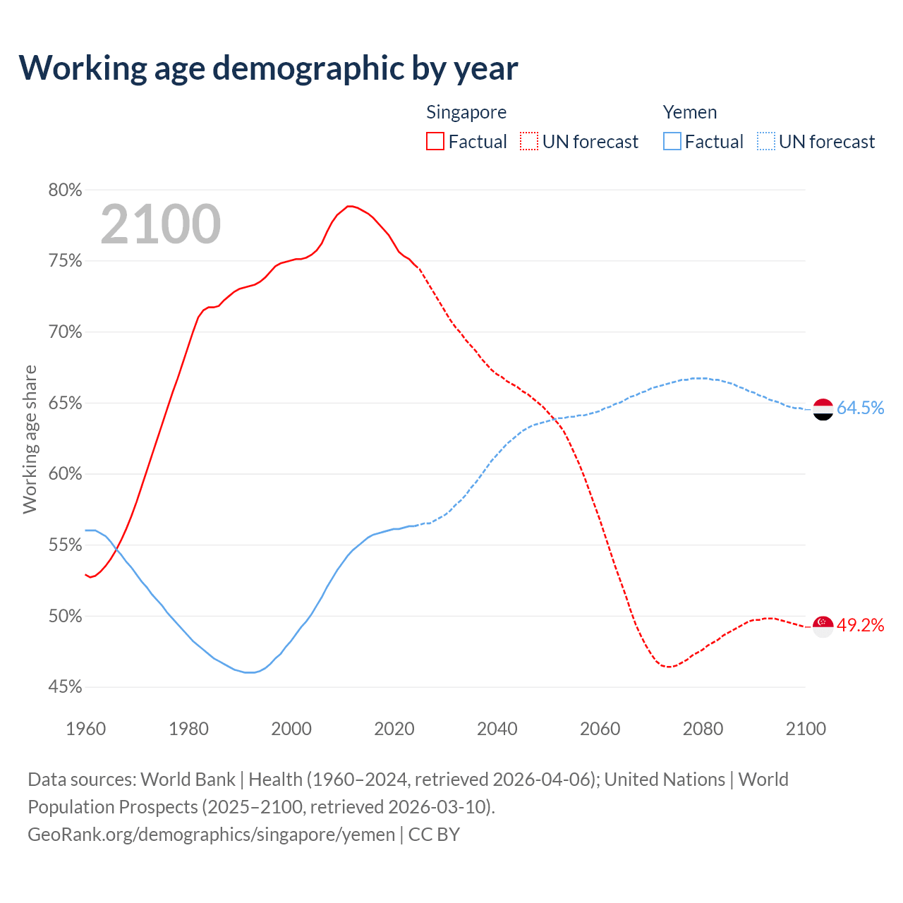 - Singapore has 4.57M working age adults (aged 15-64) vs 24.4M in Yemen.